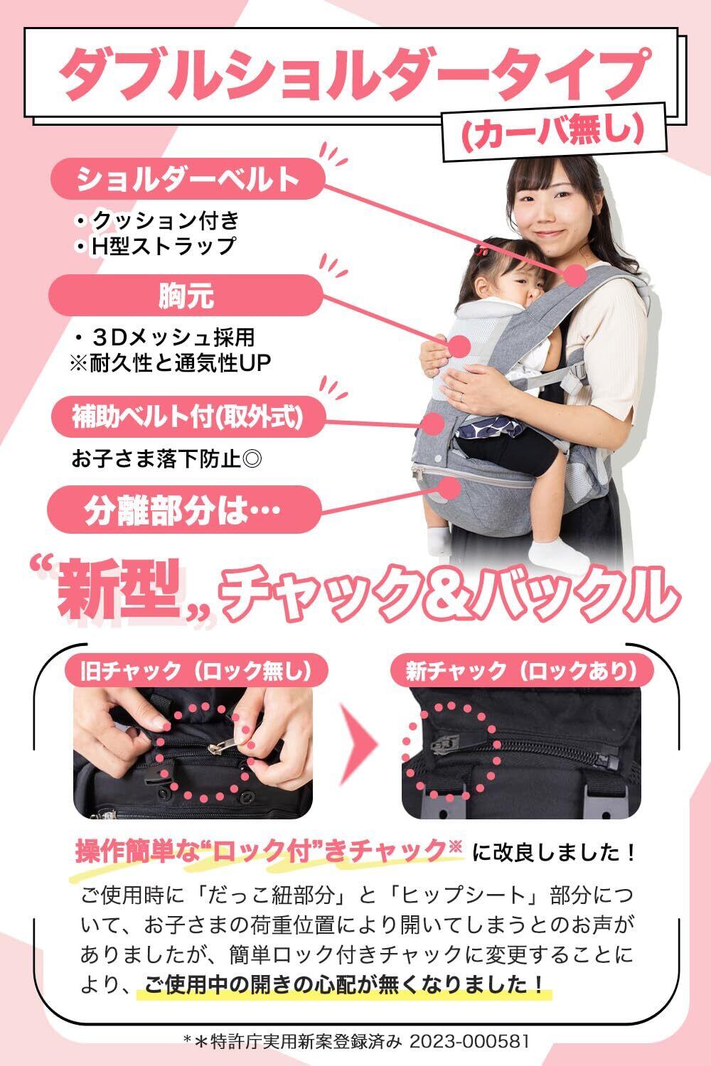【快適設計】《お子様の擦れ防止》腕ひも部分と、上部キャリア 取り付けのジッパー部分に保護布を追加したことにより大切なお子様の体が擦れるのを防止します。 《3層メッシュ採用》胸元部分は伸縮性に優れた3層メッシュを採用し通気性に優れご使用者様、お子様ともに快適にご使用いただけます。また、H型補強布もいれましたので1層のメッシュに比べ耐久性と通気性のUPを実現しました! 《ヘッドレスト》クッション性のヘッドレストパッドはお子様の頭を優しく包みます。 《肩パッド》クッション性肩パッドと通気性メッシュ素材になります。 ウェスト部分には「30mmの厚手クッション」「ムレ防止メッシュ」仕様で優しくフィットし季節を問わずご使用いただけます。シート座面(内部)は、赤ちゃんの足の開きに合わせた丸みU字構造により、股下を中心に自然なM字体勢でお座りいただけます。パパ・ママ・赤ちゃん皆が快適に使用出来るよう設計いたしました。