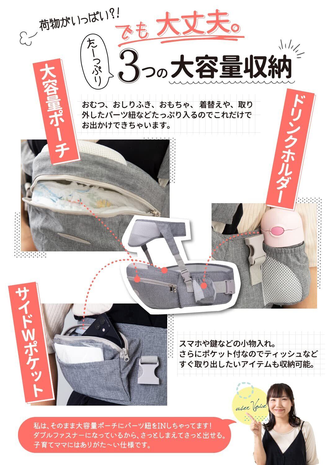 【豊富な収納力】フロント部分には、おむつやおしりふき、ガーゼやタオル、ティッシュ、ビニール袋、お食事グッズやおもちゃ、ママやパパの小物などお出かけに必要な物から、取り外したキャリア上部までしっかりと収納出来ます。またサイド部分には、携帯・スマホやカード・小銭入れ、キーケース、哺乳瓶などをしまえるポケットデザインを採用。ヒップシートとしてだけではなく収納機能にもフォーカスしましたので、ちょっとそこまでの外出にもこれひとつでお出かけできます。