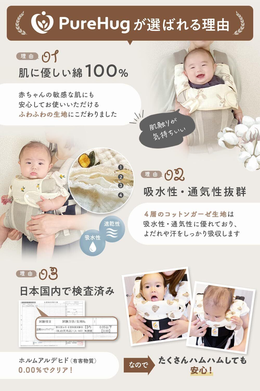 【安心・安全のコットン100%】PureHugのよだれカバーは厳しい日本のホルムアルデヒド検査で最高評価の0.00で合格!赤ちゃんの敏感な肌にも安心してお使いいただけるコットン100%にこだわりました。