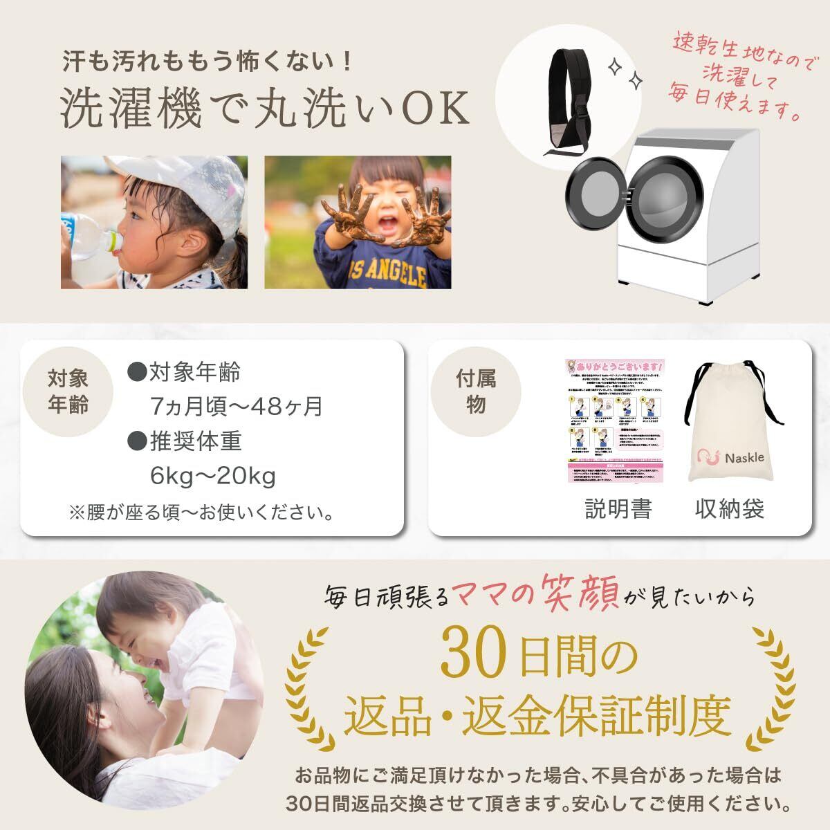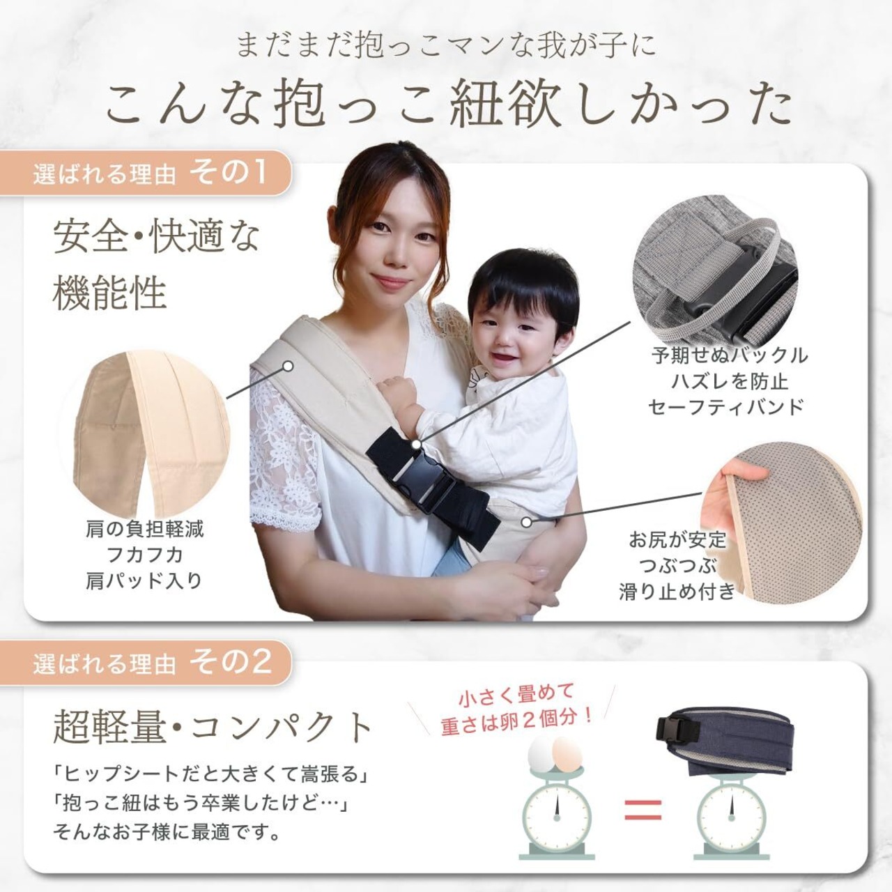 【ママも子供も嬉しい安心設計】ベビースリングのお悩み第一位を解消するべく、クッション性の高い肩ベルト採用しました。またヒップシートには滑り止め付きでズレ落ちるストレスから解放お子様のお尻をしっかりキャッチして安定した抱っこが可能です。