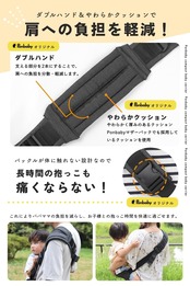【ダブルハンド&やわらかクッション】ダブルハンド&やわらかクッションで肩への負担を軽減!Ponbabyマザーバックでも採用しているクッションを使用!ダブルハンド部分が大きく広がるので、肩への負担を軽減します。さらにやわらかクッションがやさしく肩を包みます。また中央部分にはメッシュ素材も使用しているので、熱がこもらずさわやかに使用できます。