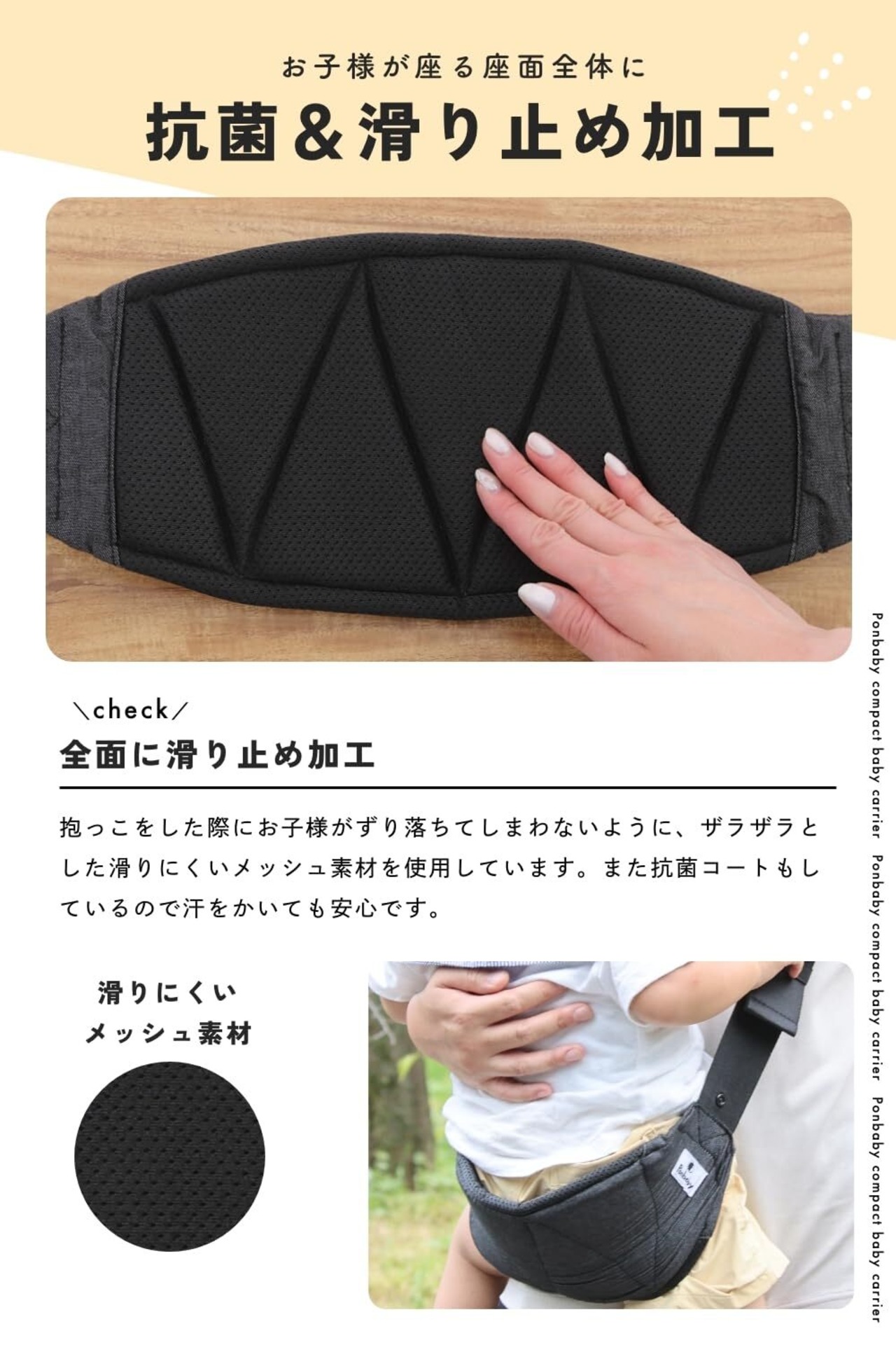 【お子様を守る滑り止め設計】お子様が座る座面全体に抗菌&滑り止め加工!抱っこをした際にお子様がずり落ちてしまわないように、ザラザラとした滑りにくいメッシュ素材を使用しています。また抗菌コートもしているので汗をかいても安心です。