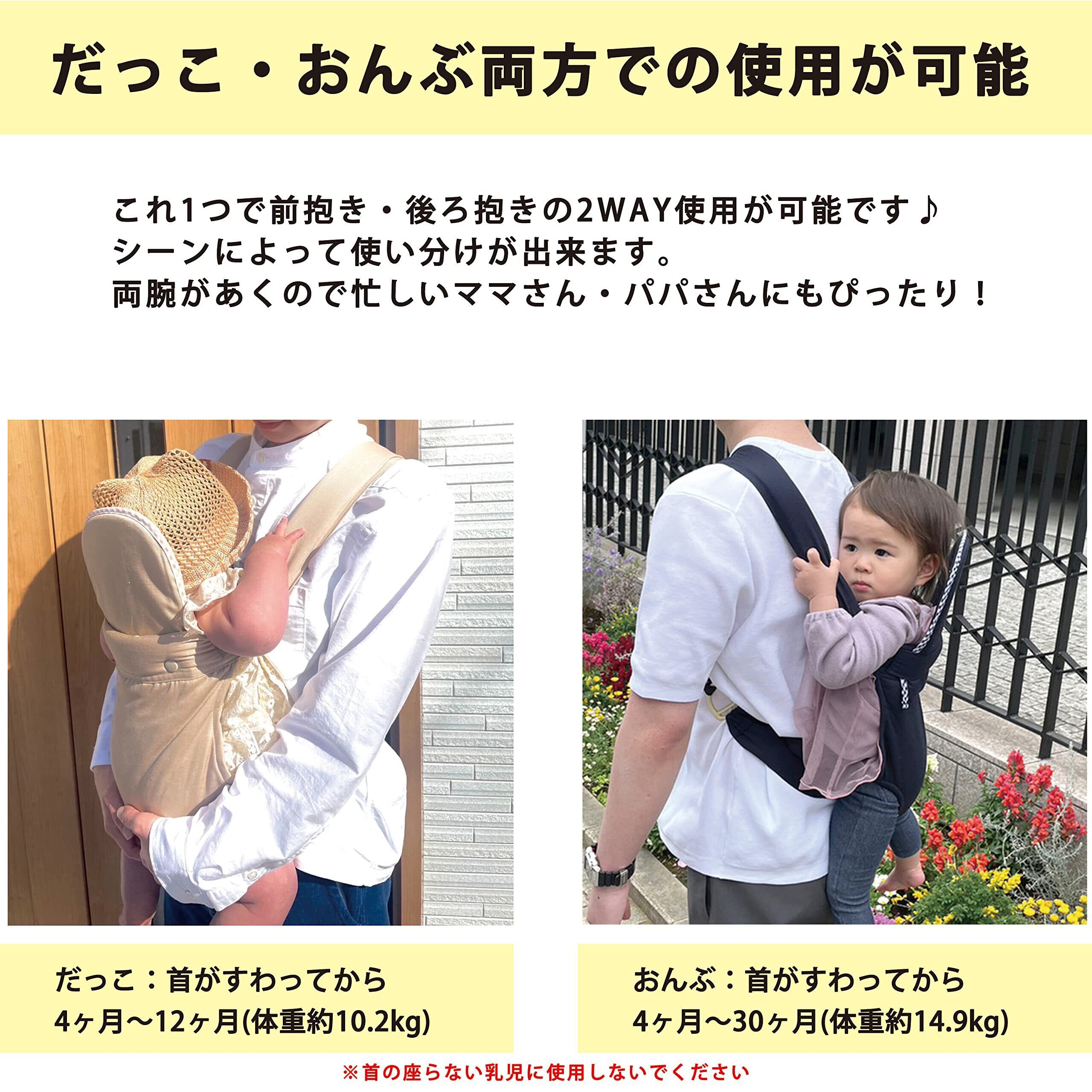 【おんぶ紐対象月齢・体重】 首が座ってから(4ヶ月)~30ヶ月 体重:約14.9kg ※首の座らない乳児には使用しないでください。