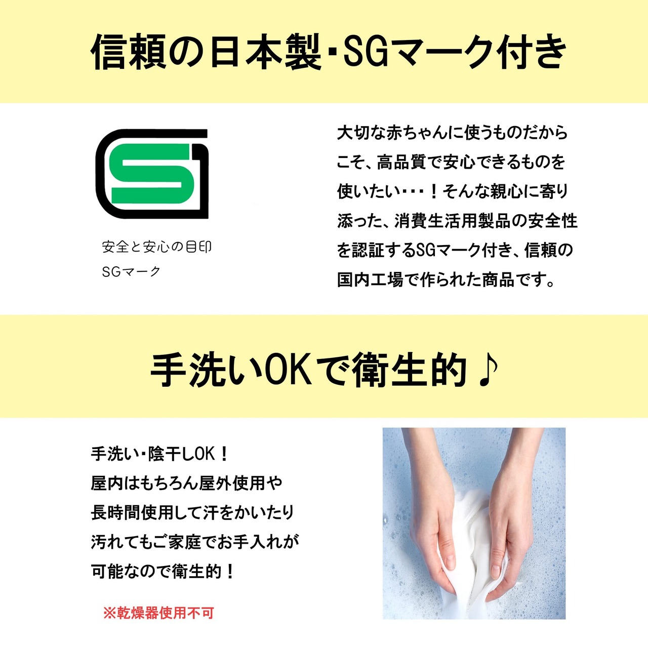 商品のお手入れ方法 乾燥器不可, 手洗いのみ