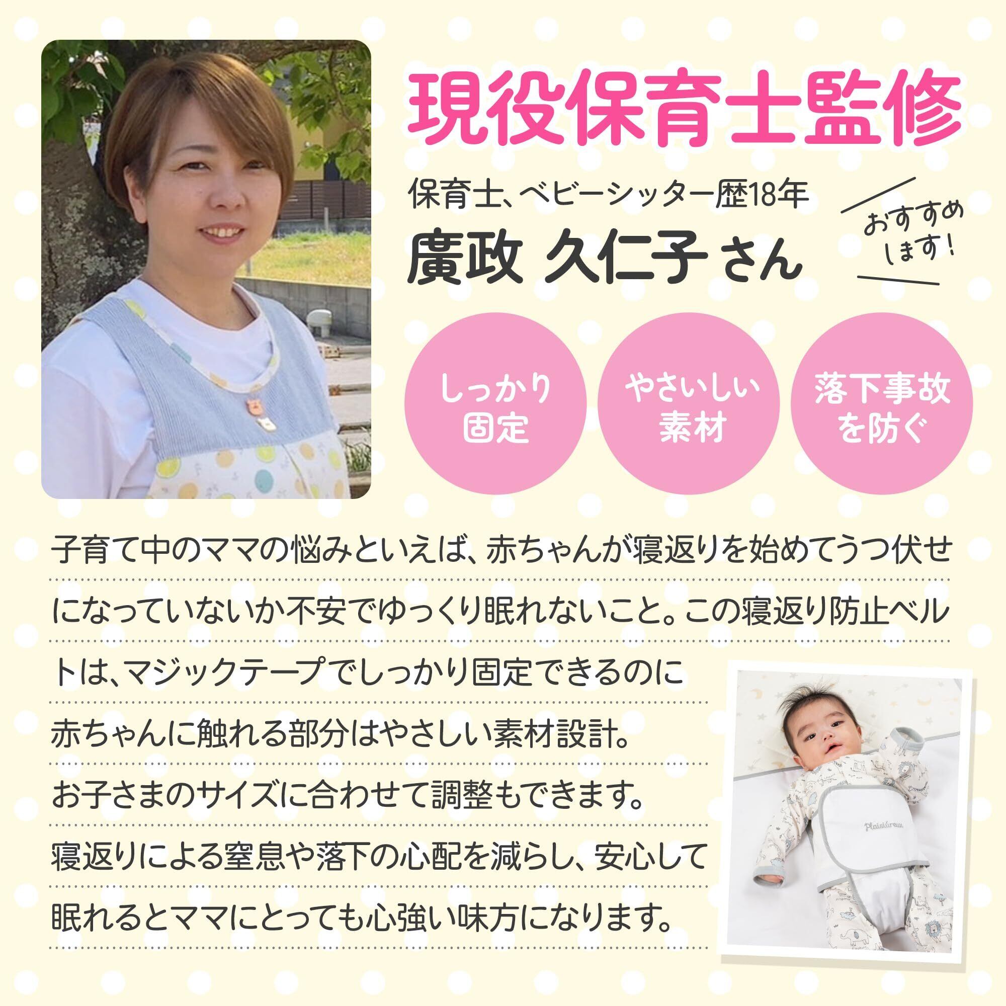 【赤ちゃんの睡眠お悩みに】新生児から9ヶ月の赤ちゃんの睡眠パターンは不安定で、すぐに目が覚めてしまったり、寝返りを打ってうつ伏せ状態になることが多々あります。この時期には、パパやママの心配事が絶えません。「赤ちゃんがうつぶせになってないかずっと心配」「乳幼児突然死症候群が心配」「赤ちゃんが寝返りの度に起きちゃう」などで不安な方にお使いいただきたいベルトです。