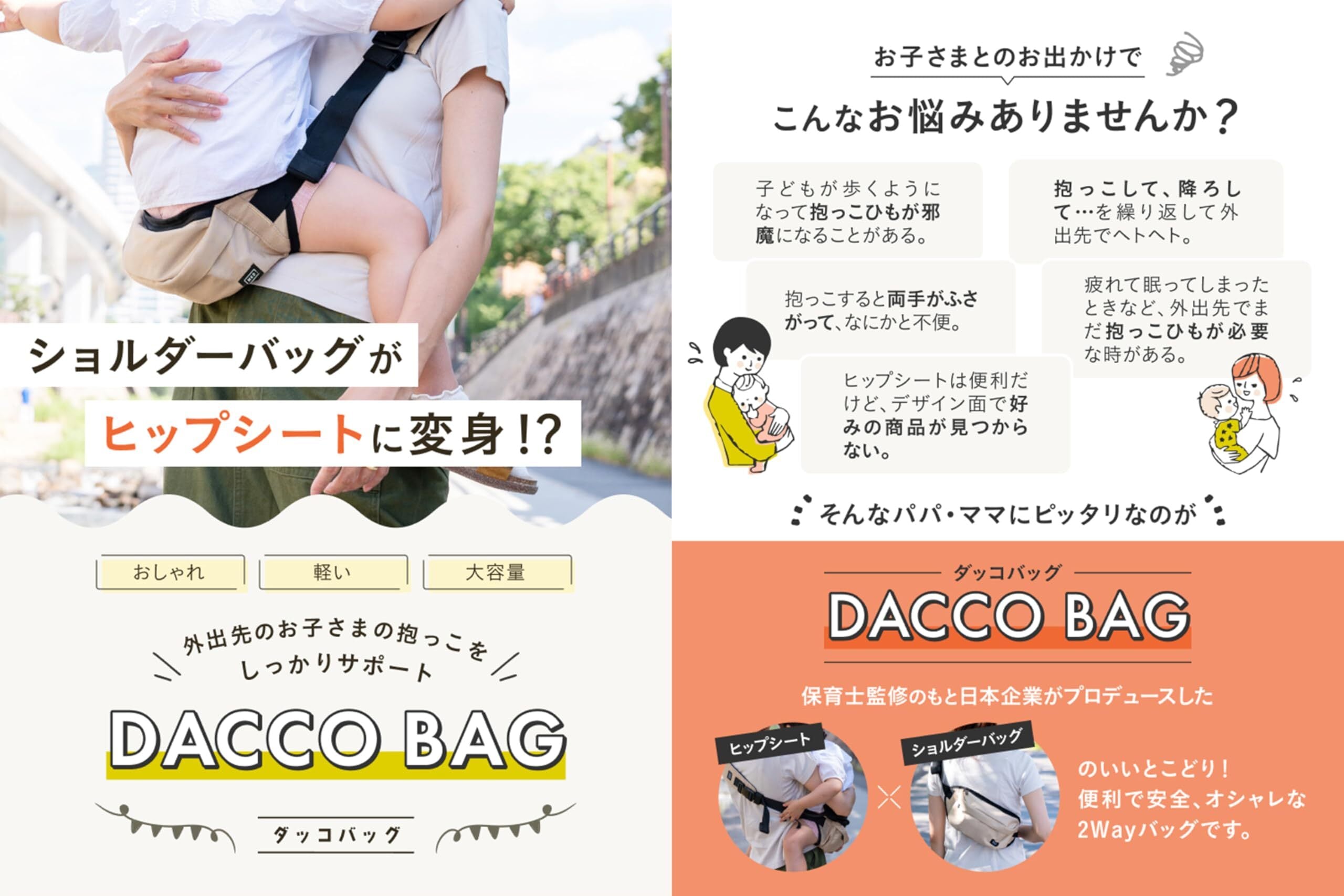 【2WAYで使える】お子様の抱っこをサポートするヒップシートとショルダーバッグを合体し、「抱っこバッグ」が誕生しました!2WAY仕様で普段はショルダーバックとして、お子様が疲れたときはヒップシートとしてお使いいただけます。