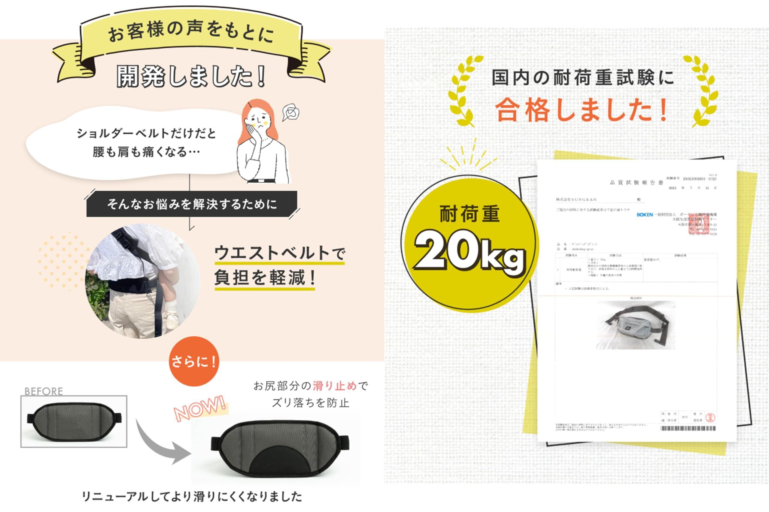 【補助ベルトで負担を軽減】ショルダーベルトだけでは肩が疲れてしまうというお客様の声を反映し、補助ベルトを追加しております。肩と腰の2点で支えることができるため、長時間の抱っこが可能になり、ベルトが体に食い込む心配もございません。