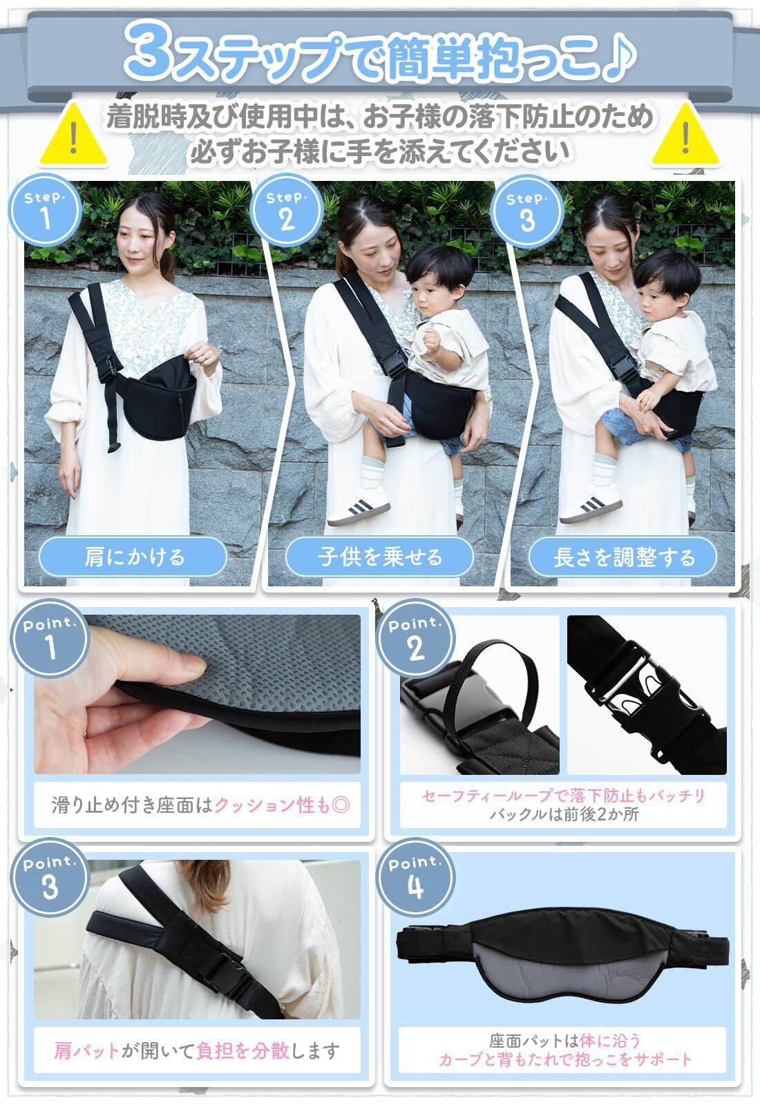 【 3ステップでカンタン抱っこ 】 1.肩にかける。 2.子どもを乗せる。 3.長さを調整する。 の3ステップで簡単に抱っこできます。お子様が抱っこしてほしい時に" パッと取り出し、サッと装着 "片手で支えながら抱っこできる 抱っこひも です。
