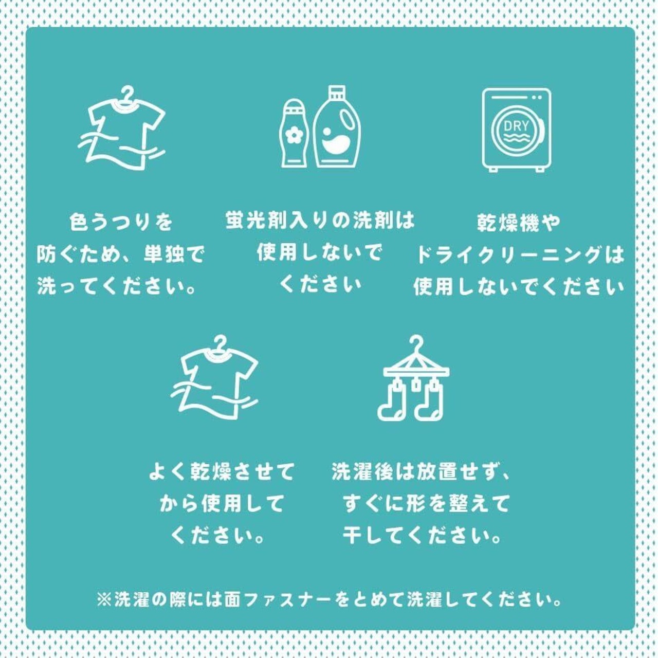 【お手入れ方法】・色落ちや色うつりを防ぐため、単独で洗ってください。・タンブル(乾燥機)乾燥はお避けください。・無蛍光洗剤を使用してください。・洗濯後は放置せず、すぐに形を整えて干してください。・よく乾燥させてから使用してください。・洗濯する際はする際は面ファスナーをとめて洗濯してください。