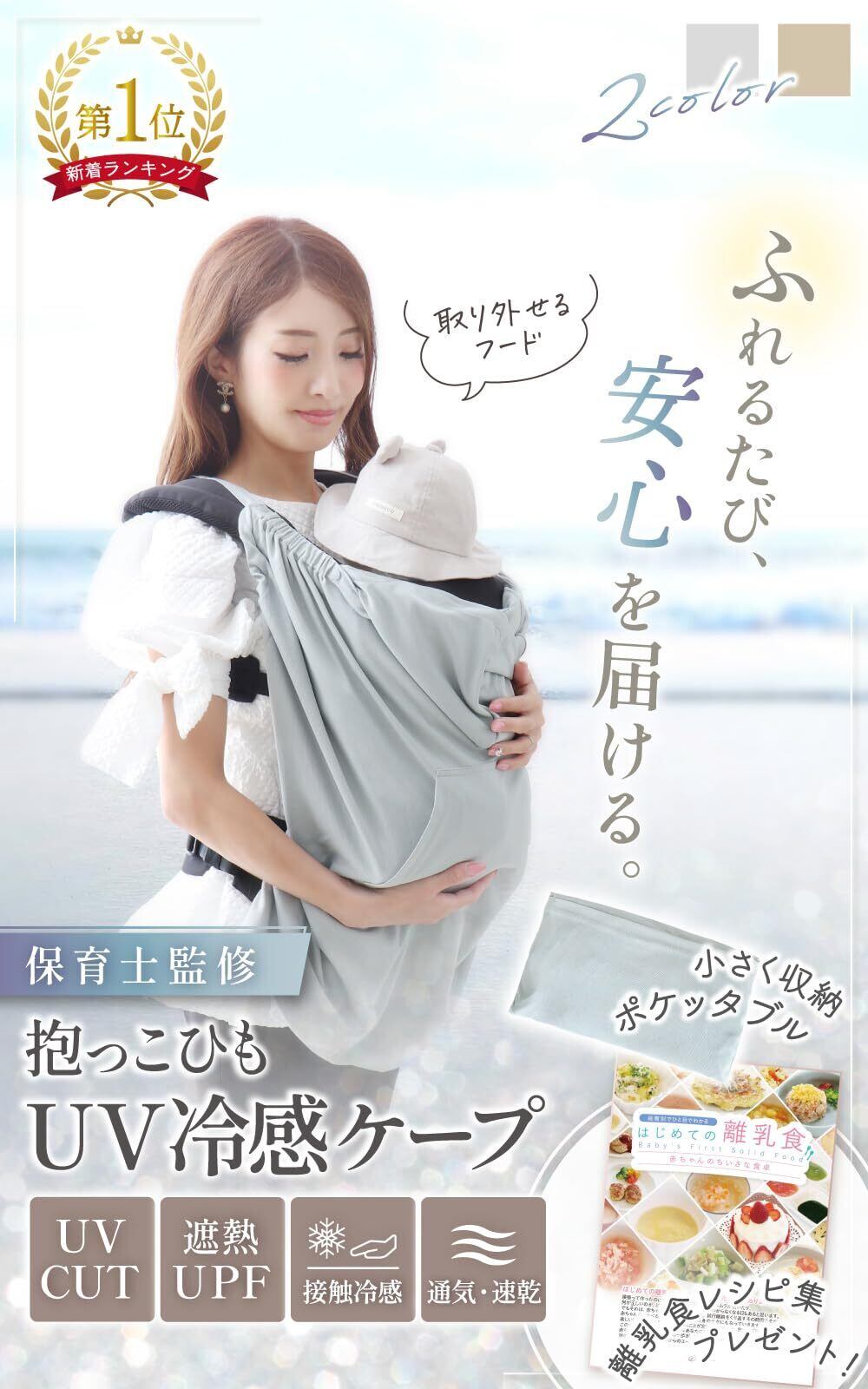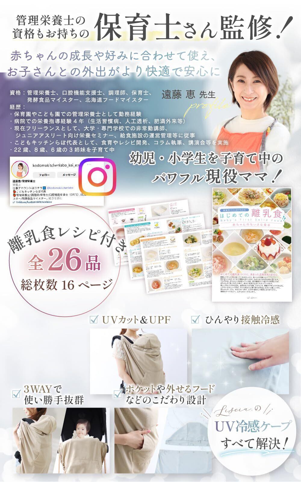 Liscia 抱っこ紐 ケープ 【保育士監修】【離乳食レシピ付き】\5項目検査済合格/【 サラッと 冷感 ドライタッチ 】 フードが外せる 冷感ケープ 3WAY 長さ調節 抱っこ紐 UVカット ベビーケープ ベビーカー ブランケット 新生児 日よけ 虫よけ 夏 紫外線対策 【 小さく収納/ポケッタブル 】 (ベージュ)