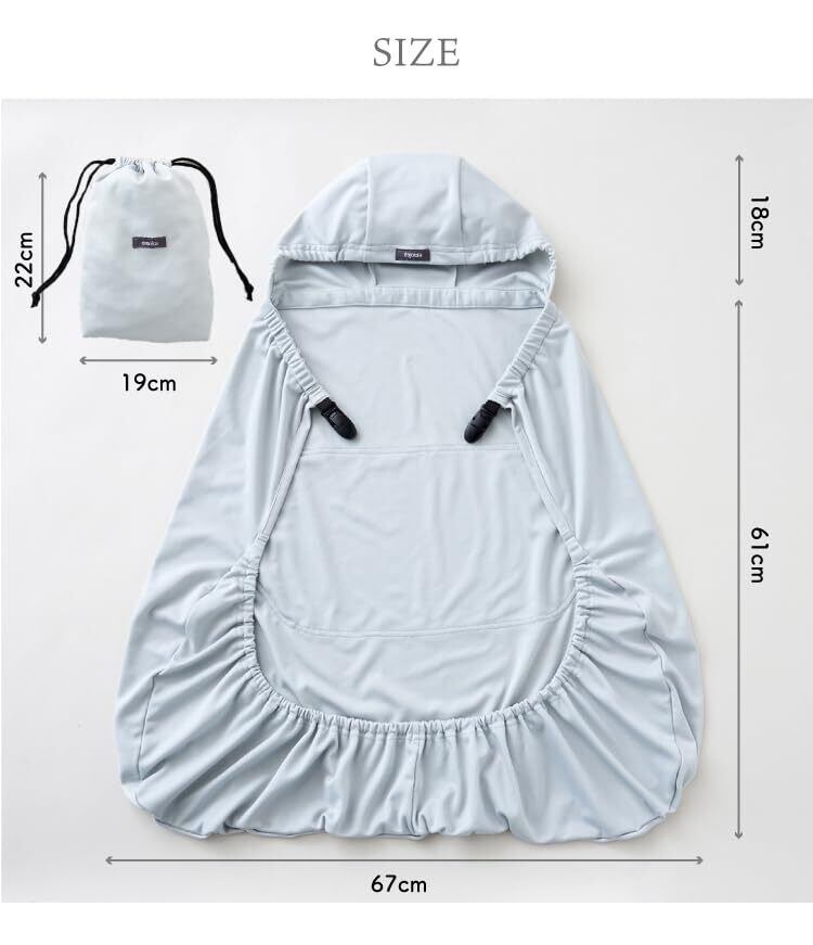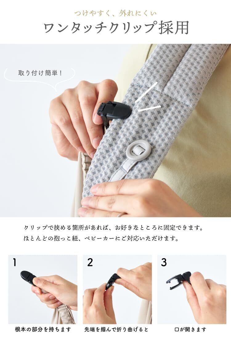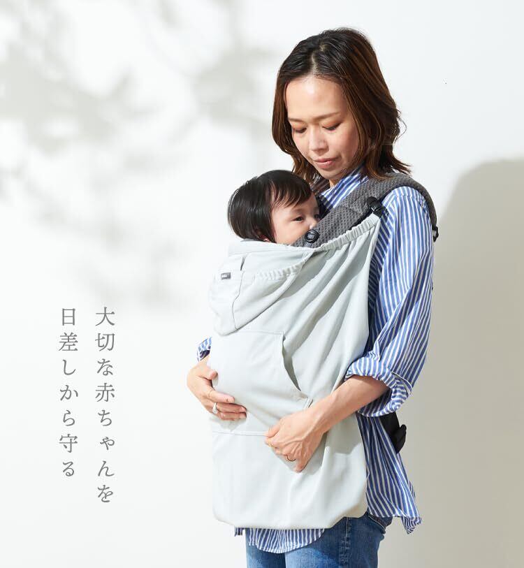 「emoka 抱っこ紐 UVケープ 接触冷感」 大切な赤ちゃんを紫外線から守る。 UVカット率が97%以上で、UPF50+の高い保護効果を持っています。 接触冷感と通気性に優れており、快適な使用感を提供します。また、ドライ生地を使用しているため、乾きが早く、肌触りも良いです。 装着は簡単なのに、外れにくいワンタッチクリップが採用されています。赤ちゃんが蹴っても外れる心配はありません。 さらに、前面にはポケットが付いており、ハンカチなど小さなアイテムを入れることができます。 使わないときには、簡単に収納できる小さなポーチも付属しています。 日差しが強い日のお出かけに最適ですが、クーラーが効いた部屋での冷え防止にも使用することができます。 デザインはシンプルな無地であり、抱っこ紐やお洋服とも合わせやすいです。