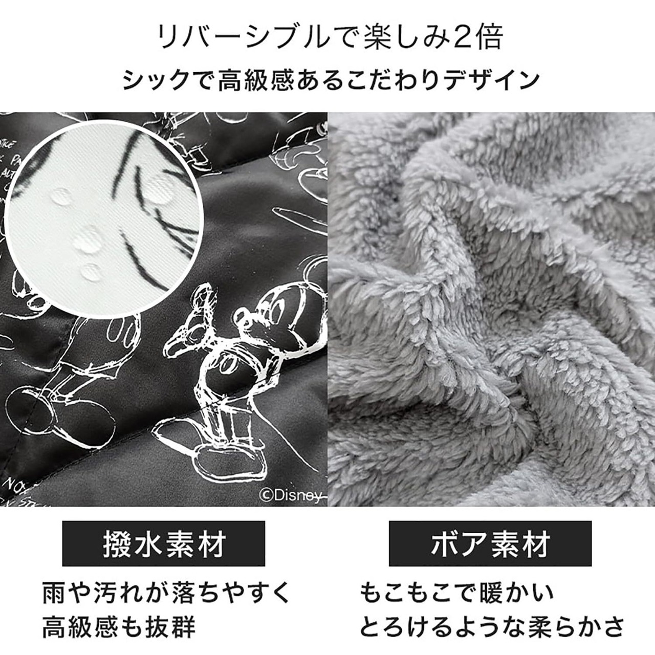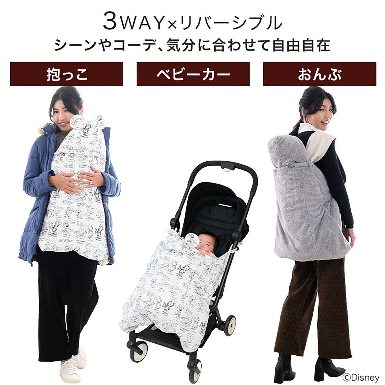 【便利な3WAY!ディズニーデザインがかわいいマルチケープ】抱っこ・おんぶ・ベビーカー、シーンやコーデに合わせて自由自在にご着用いただけます。リバーシブルで楽しみ方2倍!表面は撥水素材で汚れや雨にも強いです。裏面はボア素材で、冬の冷たい風邪をシャットダウン。