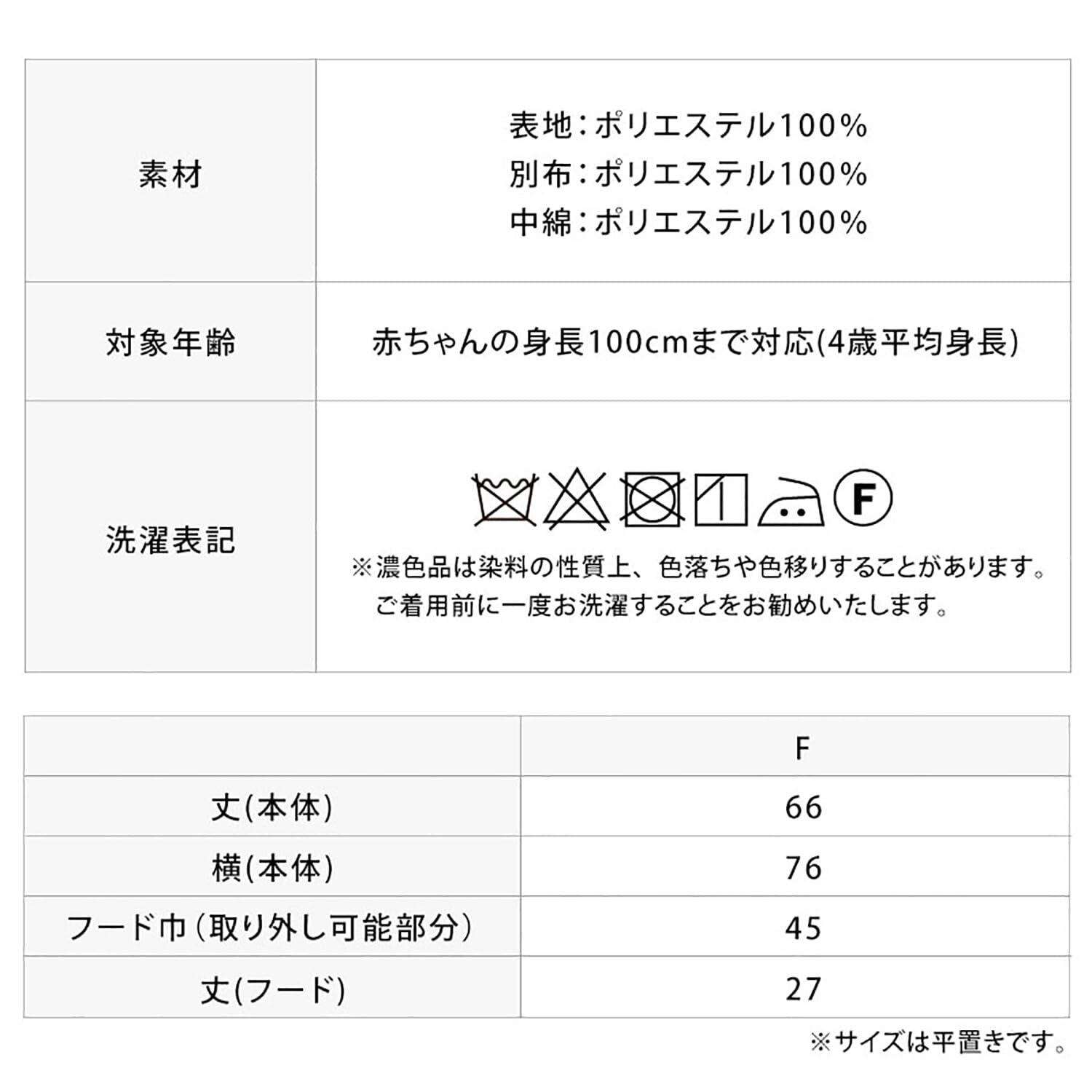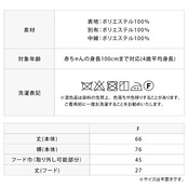丈(本体)66、横(本体)76、フード巾(取り外し可能部分)45、丈(フード)27