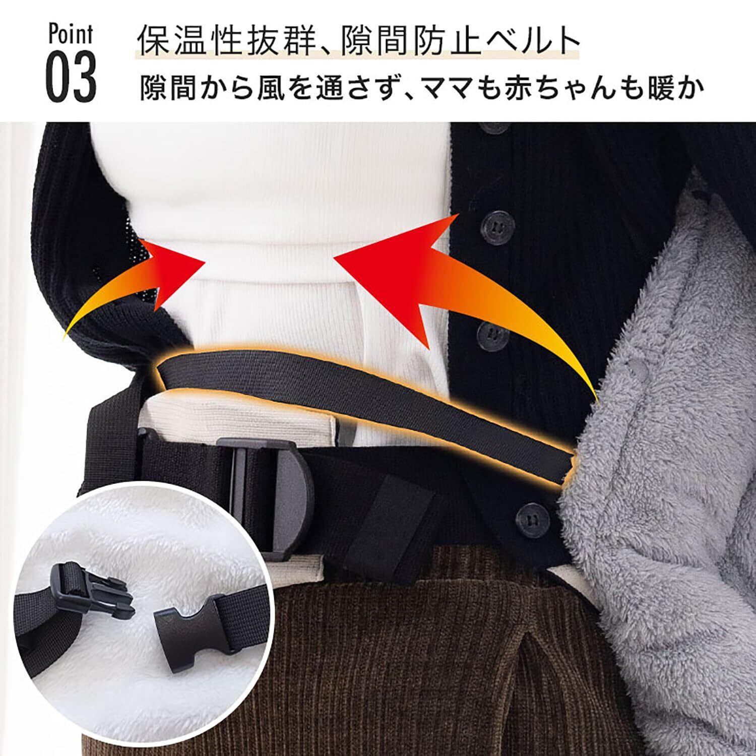 【Point!】①取り外し可能なフード。②ママの手も暖かい、手袋要らずのファスナーポケット付き。③お腹部分には保温性をアップさせる為の隙間防止ベルト付き。④足先まで包み込む、深くて広いポケット付で赤ちゃんの足も暖かいです。⑤抱っこ紐やベビーカーへの取り付けは、スナップボタンをパチッと付けるだけ。