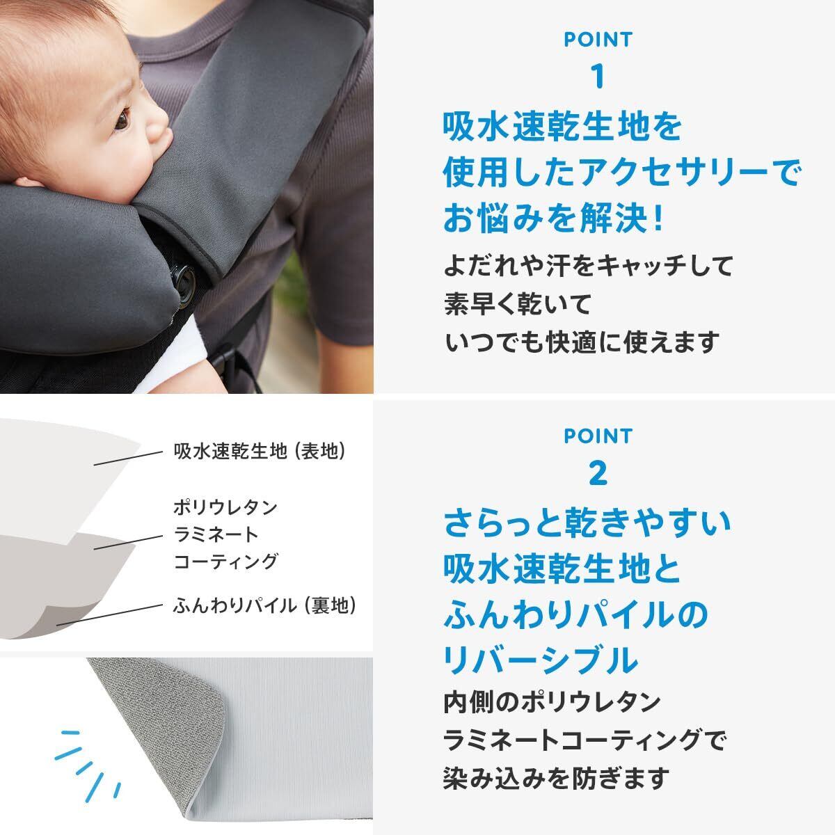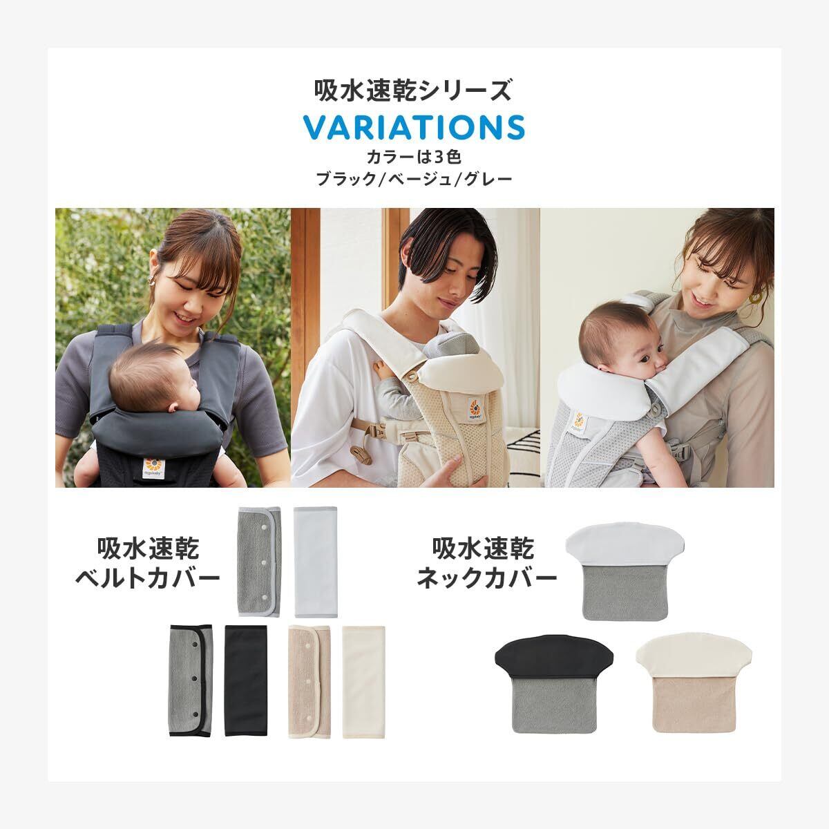 抱っこひもをキレイに保つ必需品。 赤ちゃんは肩ひもをなめたり噛んだりするので、ベルトカバーでよだれをキャッチ。 毎日使う抱っこひもを清潔に保てます。 さらっと乾きやすい吸水速乾生地と、ふんわりパイルのリバーシブル。 内側のポリウレタンラミネートコーティングで、染み込みをしっかり防ぎます。 エルゴベビーの抱っこひものために設計された、エルゴベビー公認アクセサリー。