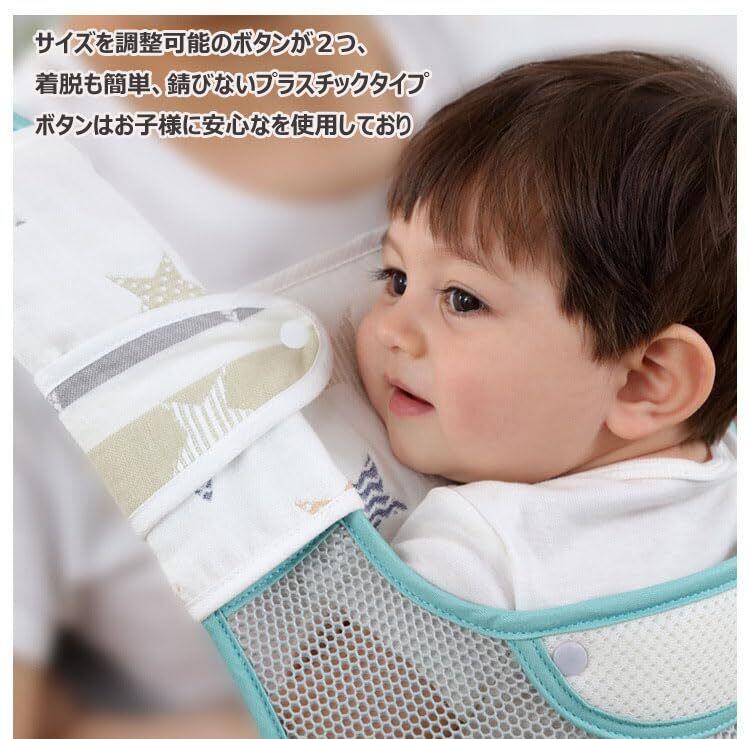 着脱簡単: スナップボタンで簡単に取り付け・取り外しできます。抱っこひもだけでなく、ベビーカーやチャイルドシートなどにも使用でき、非常に便利です。