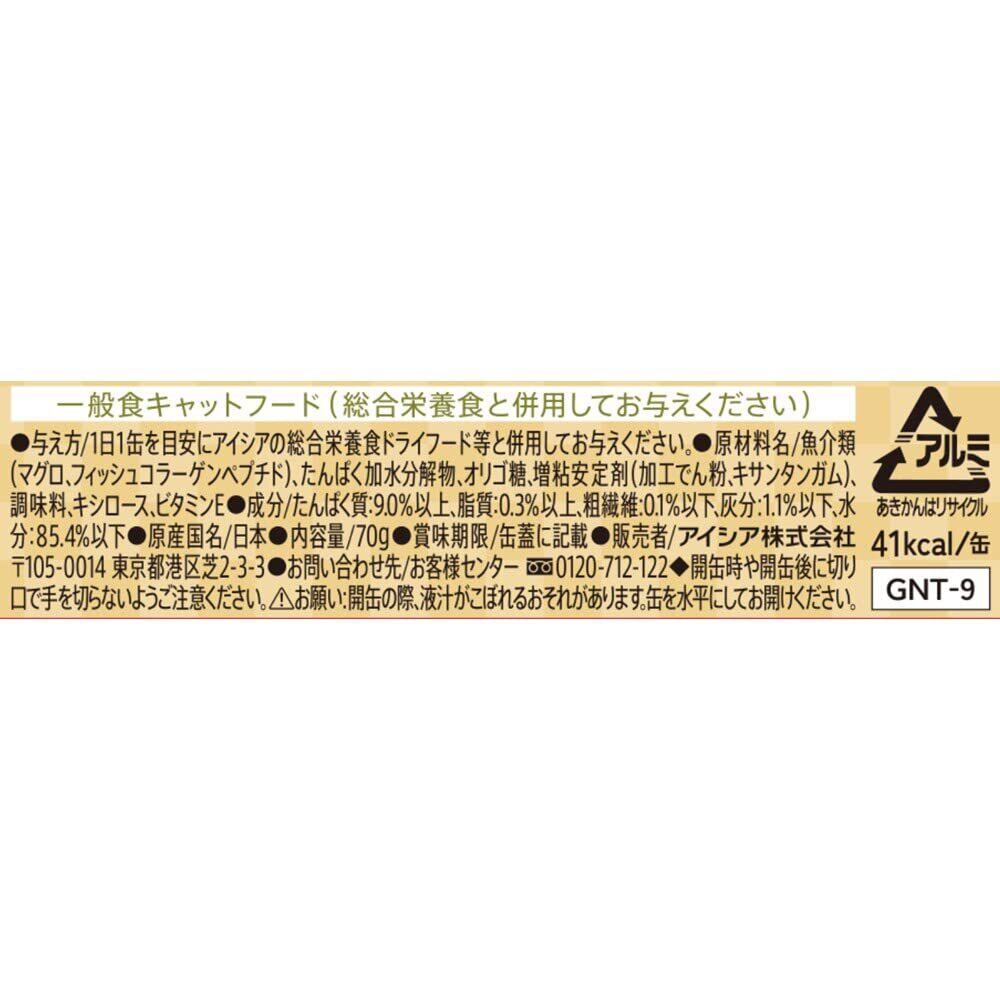 【原材料】 魚介類(マグロ、フィッシュコラーゲンぺプチド)、たんぱく加水分解物、オリゴ糖、増粘安定剤(加工でん粉、キサンタンガム)、調味料、キシロース、ビタミンE 【保証成分】 たんぱく質9.0%以上、脂質0.3%以上、粗繊維0.1%以下、灰分1.1%以下、水分85.4%以下 【エネルギー】 41kcal/缶