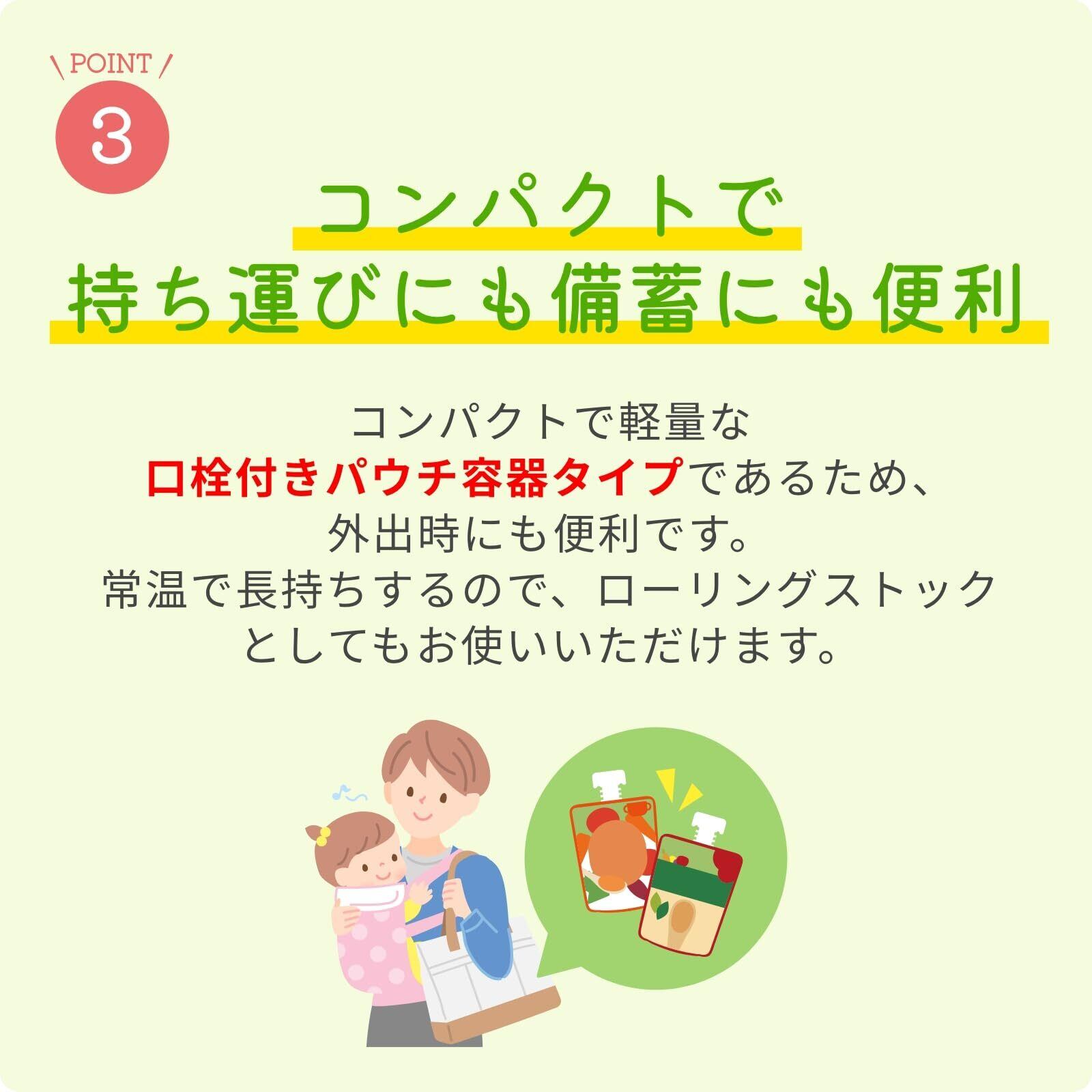 素材本来のおいしさにこだわった、はじめての離乳食にぴったりのベビーフードです。 離乳食をはじめる5ヵ月頃から食べられます。持ち運びしやすい口栓付きパウチを使用し、中身はスプーンであげやすいように なめらかなペースト状に仕上げているため、いつでもどこでもお子さまに食べさせられるのが特徴です。 りんごとかぼちゃにとうもろこしを加えることでまろやかな味わいに仕上げました。