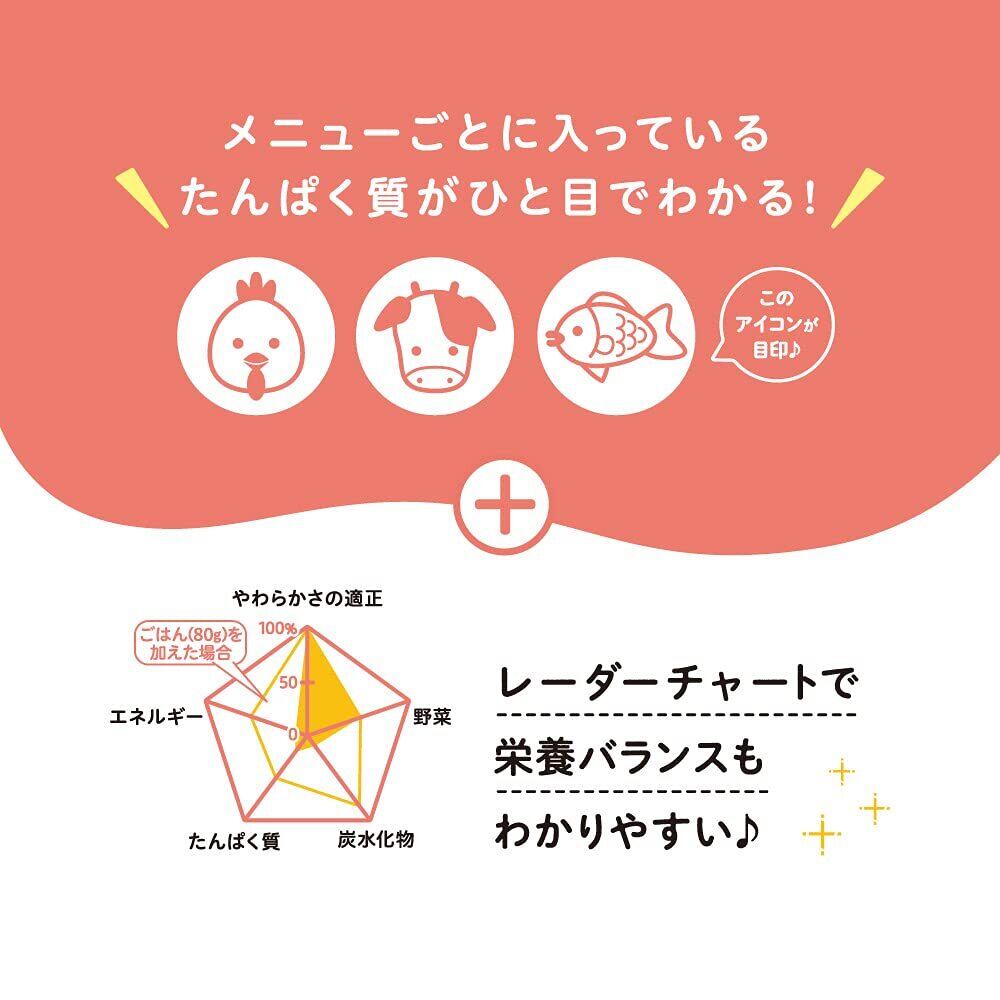 12種類の野菜1食分がとれる野菜シリーズです。 レーダーチャートが付いているので栄養バランスが一目でわかります。 たんぱく質アイコンでメニュー選びをサポート <食育レシピ野菜の特徴> ●12種類の野菜配合で、1食分に必要な野菜40gが摂れます。 ●12ヵ月頃からの赤ちゃんのかむ力の発達に合わせて、具材の大きさや固さを考えて調理しました。 ●内容量 100 g