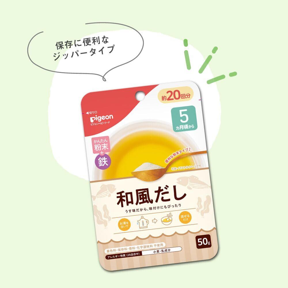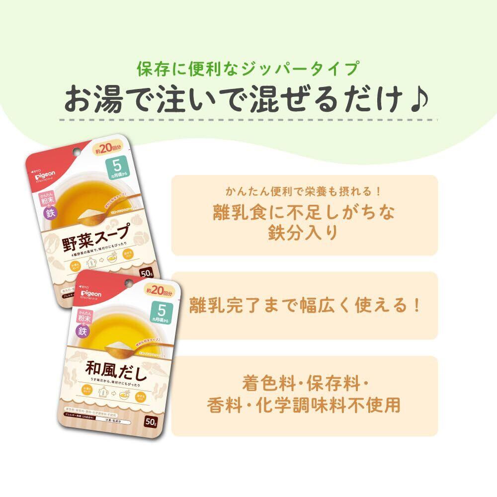 お湯に注いで、混ぜるだけ。味付けまろやか、やさしいおみそ汁です。 <かんたん粉末+鉄の特徴> ●豆乳のまろやかさとお味噌の豊かな風味をあわせたうす味のお味噌汁です。 ●1回分でほうれん草5.56g分の鉄分が取れます。 (*日本食品標準成分表(2020年)ほうれん草の葉、通年平均、ゆでの値) ●5ヵ月頃から離乳完了(18ヵ月頃)まで幅広くご使用いただけます。 ●さっと溶ける粉末タイプ ●保存に便利なジッパー付き ●内容量:41g(1人45mlで17回分 )