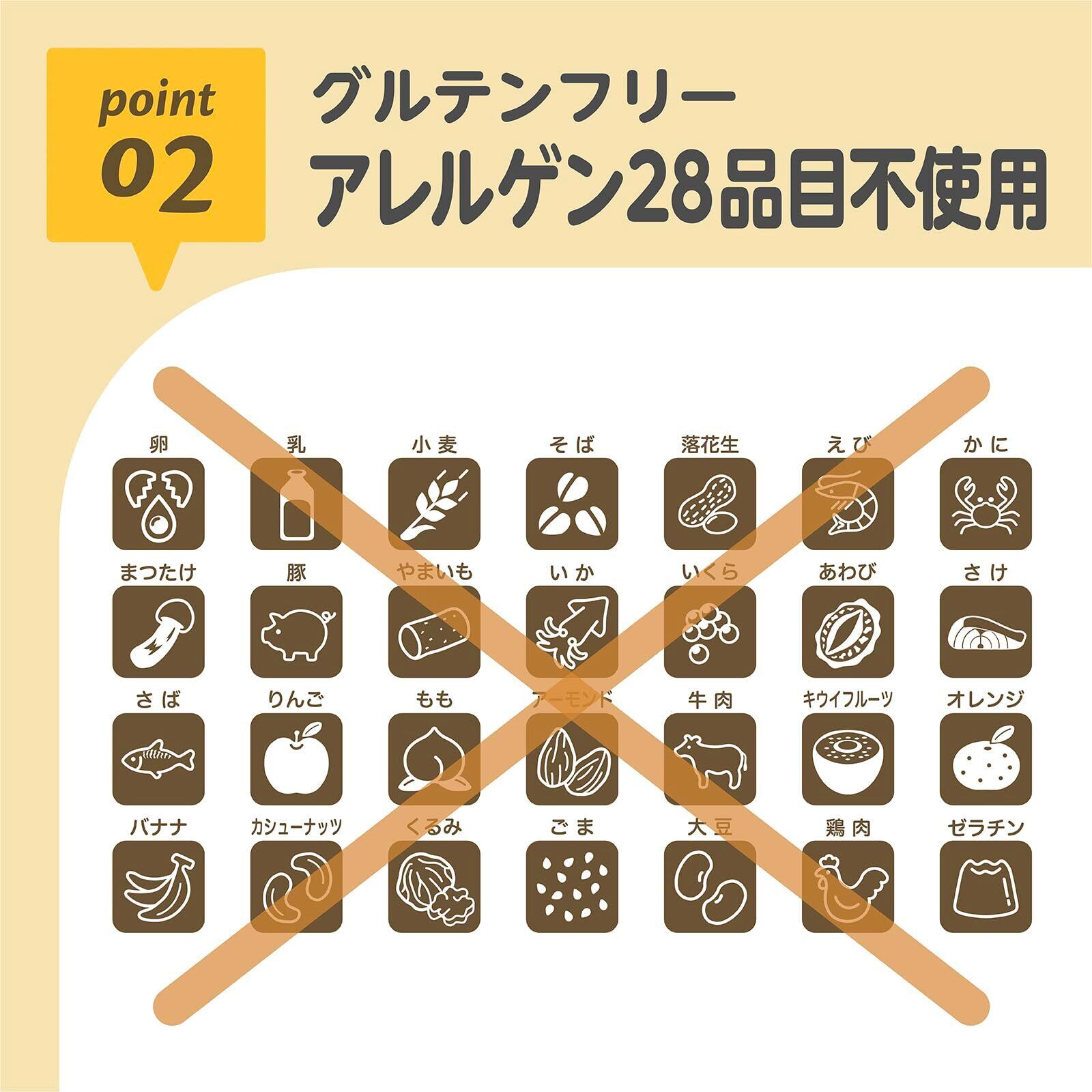 卵・乳製品・小麦を一切使用せずアレルギー対応食品として敏感な赤ちゃんにも与えられます。保存料や香料も使わずにシンプルな素材のみで作られているため、素材本来の自然な甘みと味わいが特長です。食品添加物が気になるご家庭でも取り入れられるスナックです。