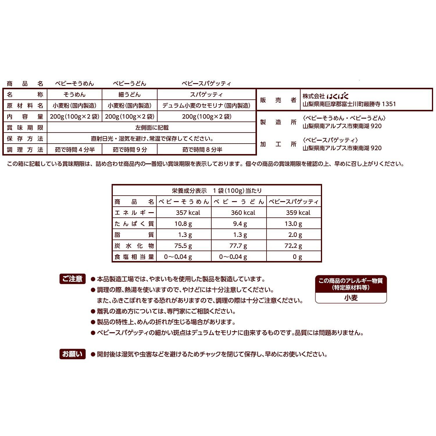 原材料:【ベビーそうめん】小麦粉(国内製造)、【ベビーうどん】小麦粉(国内製造)、 【ベビースパゲッティ】デュラム小麦のセモリナ