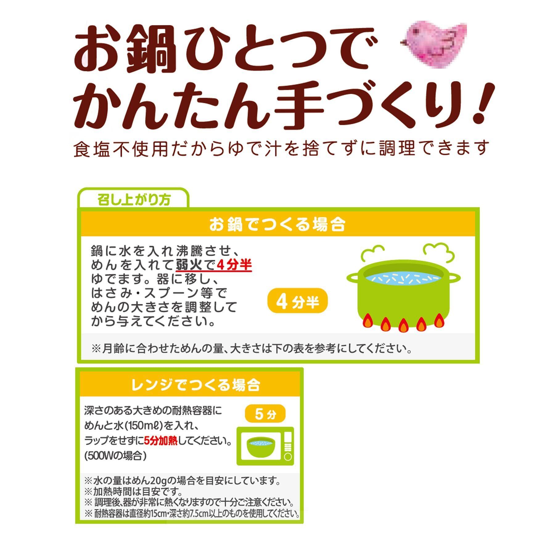 【お鍋でつくる場合】鍋に水を沸騰させ、めんを入れて4分半弱火でゆでます。器に移し、はさみ、スプーン等でめんの大きさを調整してから与えてください。【レンジでつくる場合】深さのある大きめの耐熱容器にめんと水(150ml)を入れ、ラップをせずに5分加熱してください(500Wの場合)