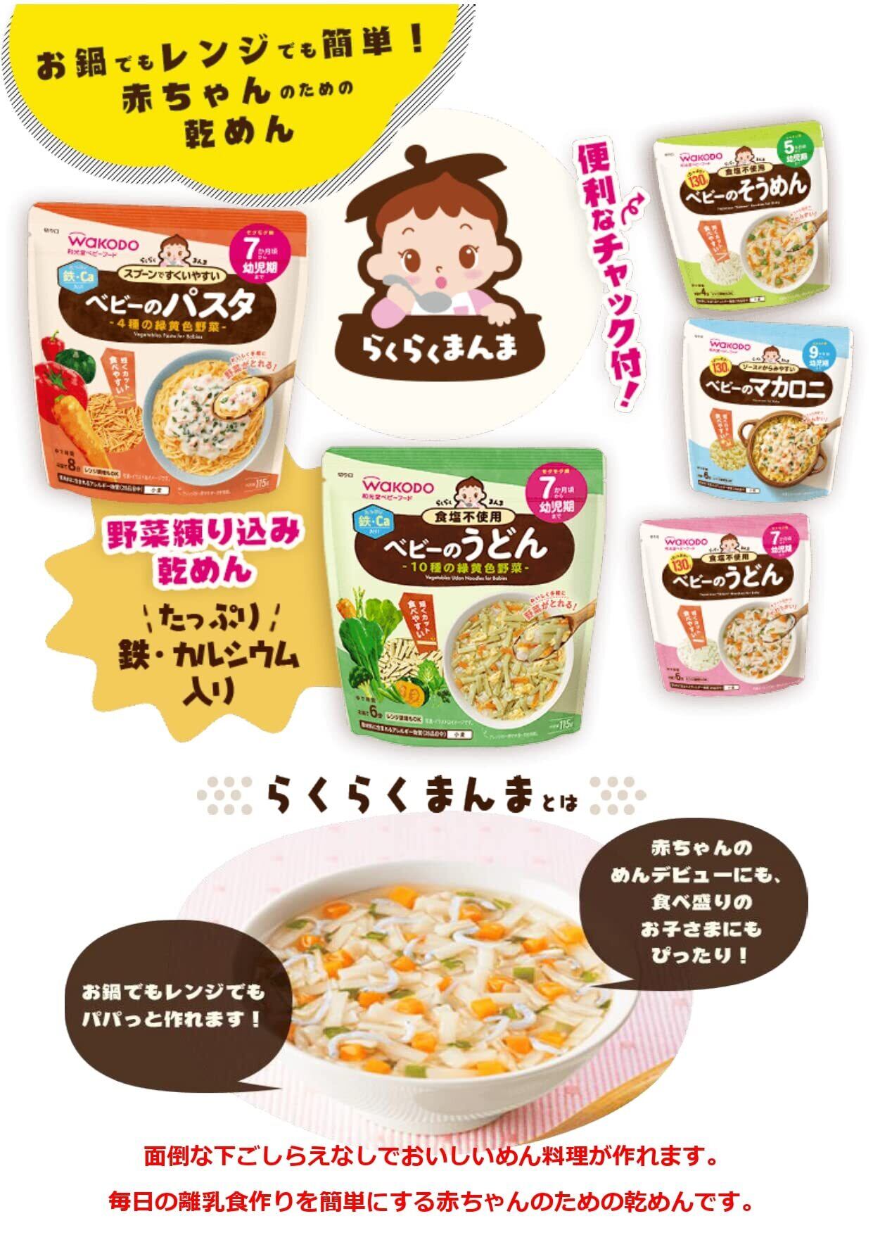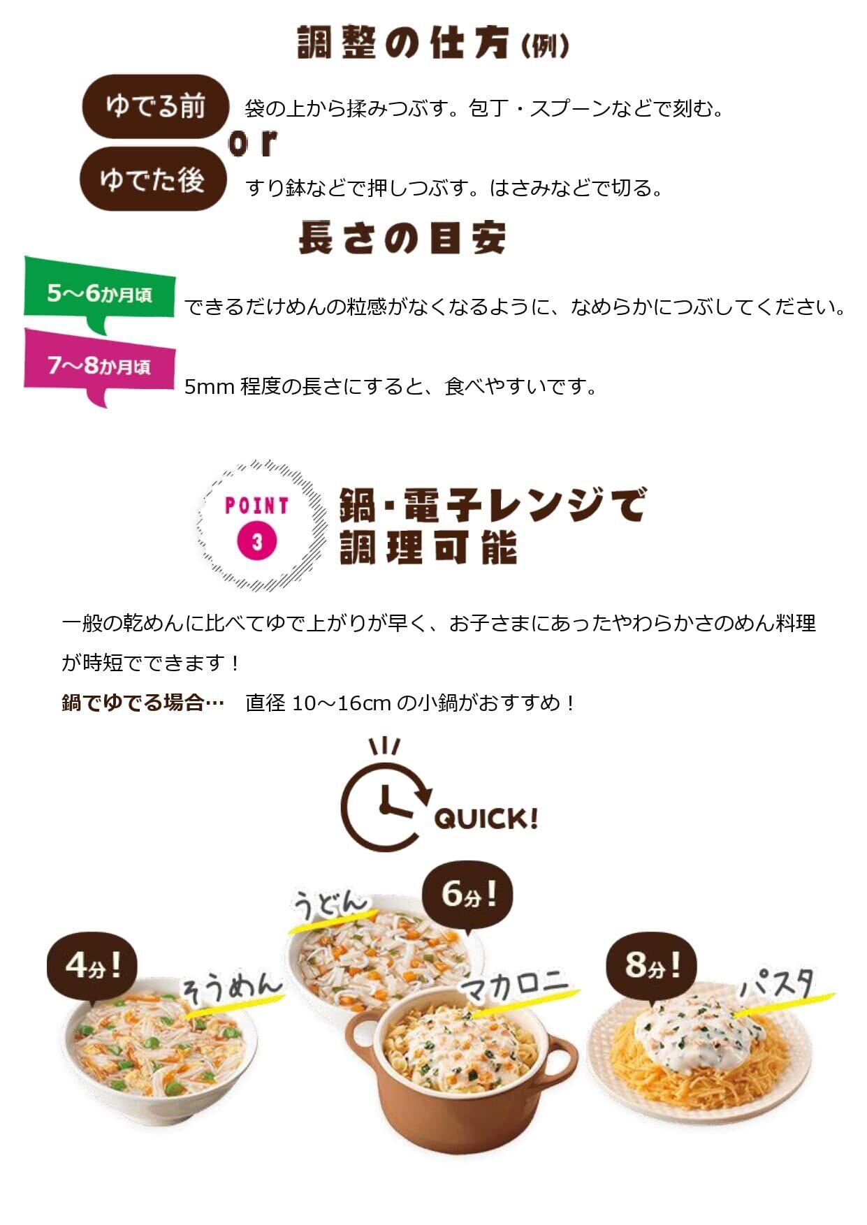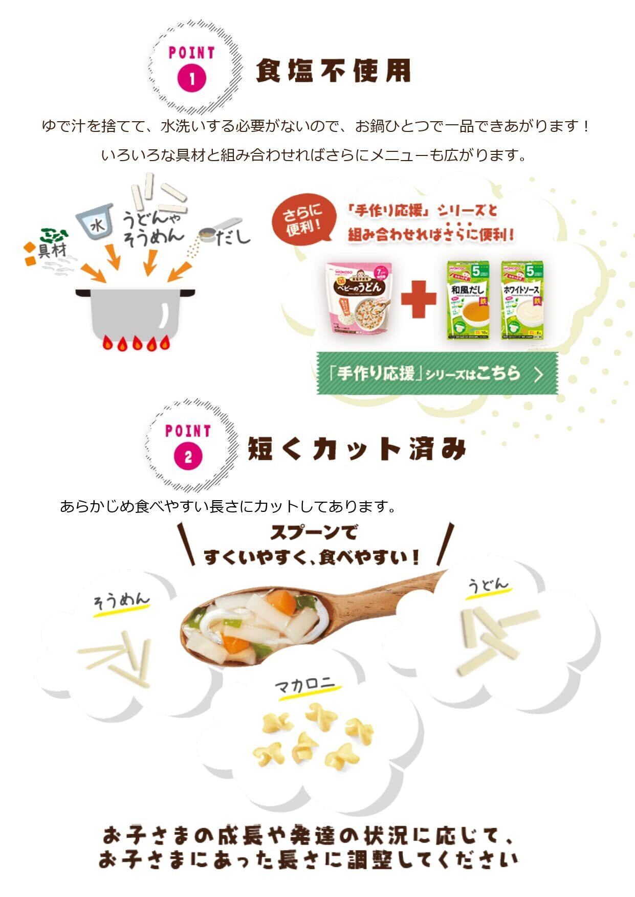 毎日の離乳食作りを簡単にする、赤ちゃんのための乾めんシリーズです。スプーンですくいやすい長さにカットしました。食塩不使用なのでお鍋ひとつでうどんのメニューが作れます。ゆで汁を捨てて、水洗いする必要がないので、お鍋ひとつで一品できあがります。いろいろな具材と組み合わせればさらにメニューも広がります。 安全警告 ●お湯のお取り扱いにご注意ください。●香りの強いものと一緒に保管しないでください。●開封後は湿気や虫害を避けるためにチャックをしっかりと閉めて保管し、なるべく早めにお使いください。●食べ残しや作りおきはあげないでください。●月齢は目安です。あせらず段階的にすすめましょう。●離乳のすすめ方については、専門家にご相談ください。●製品の特性上、割れ欠けが生じるばあいがあります。