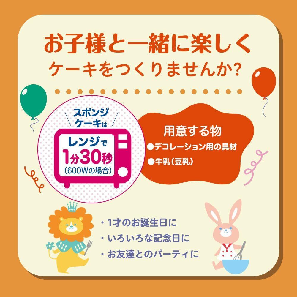 1才から食べられる「手作りケーキセット」。簡単・短時間で作れ、お子さまと一緒にケーキ作りが楽しめます。 自然な甘さのかぼちゃ味です。 牛乳50mlを入れて混ぜ、電子レンジで90秒加熱(600wの場合)で、スポンジケーキが作れます。 ケーキミックスに、ホイップクリーム粉末、ケーキ型、しぼり袋・口金もセット。すぐ作れます。 甘さ控えめ、ホイップクリームは脂肪分50%カット。