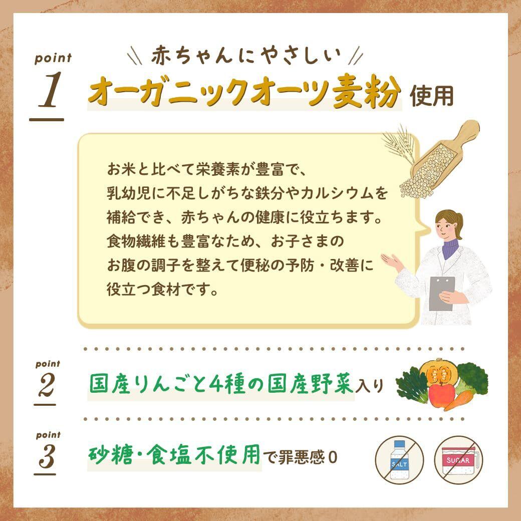 【特徴】・有機オーツ麦粉と国産りんご、4種の国産野菜(人参、かぼちゃ、ほうれん草、ブロッコリー)使用