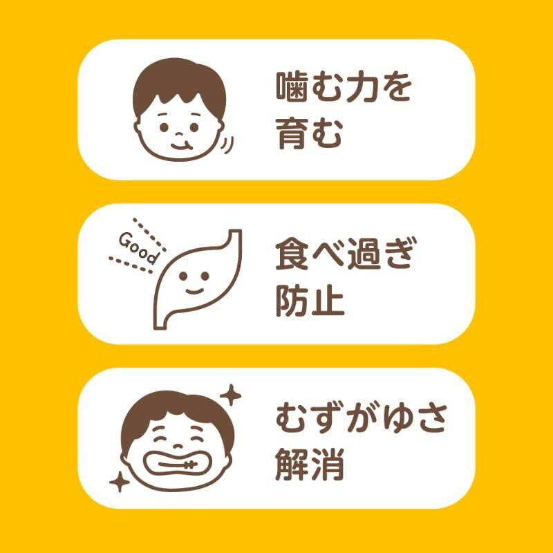 ●カルシウム、食物繊維入り。●香料・着色料・保存料 不使用。●むずがゆさ解消。●食べすぎ防止。●噛む力を育む。※噛む練習をする前や普段から丸呑みしやすいお子様に食べさせる際は十分にご注意ください。