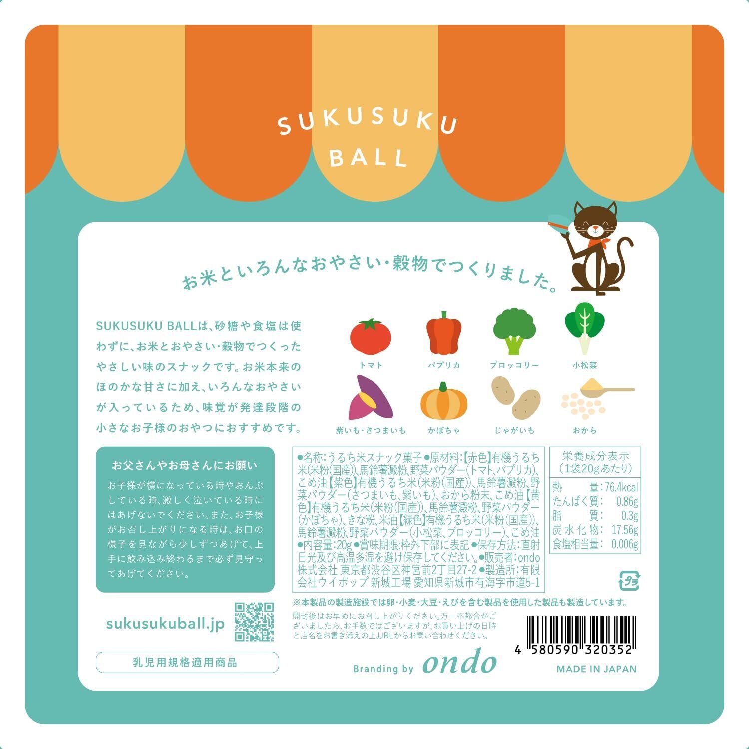 スクスクボール(20g × 3袋入り)国産有機米とおやさいと穀物をだから、小さなお子様や乳幼児に必要なエネルギーと栄養を。 無添加・砂糖不使用・食塩不使用の安心安全な小さなお子様用のおやつ。賞味期限:2026年2月7日まで(キッズデザイン賞2024年度 受賞!)