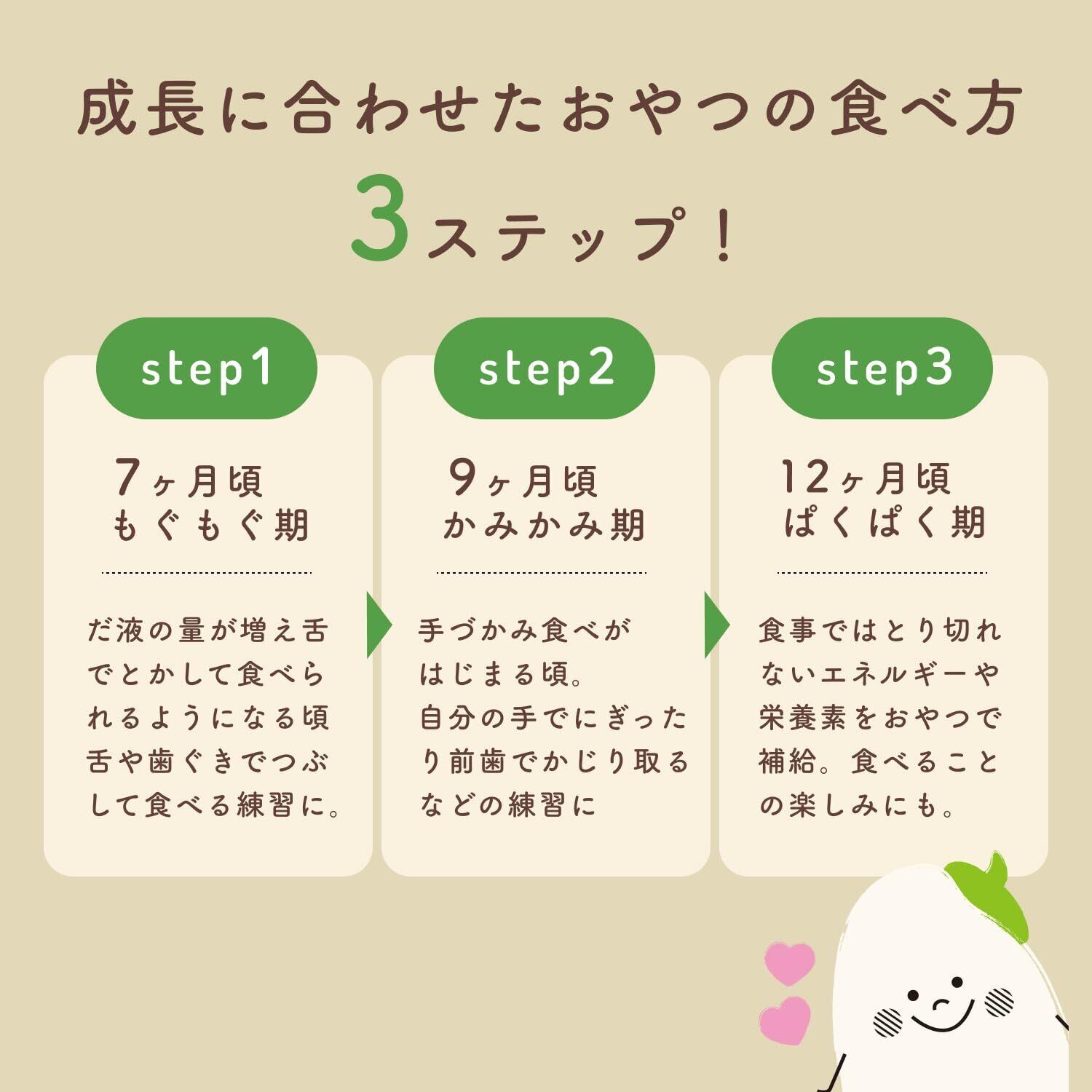 [ アレンジもOK! ]そのままお召し上がりいただくのもいいですが、 赤ちゃん の成長に合わせた おやつ として使用したい場合はアレンジもOKです。簡単なのは、お湯を加えてつぶしながら混ぜるだけ、ちょっとしたおかゆになります。