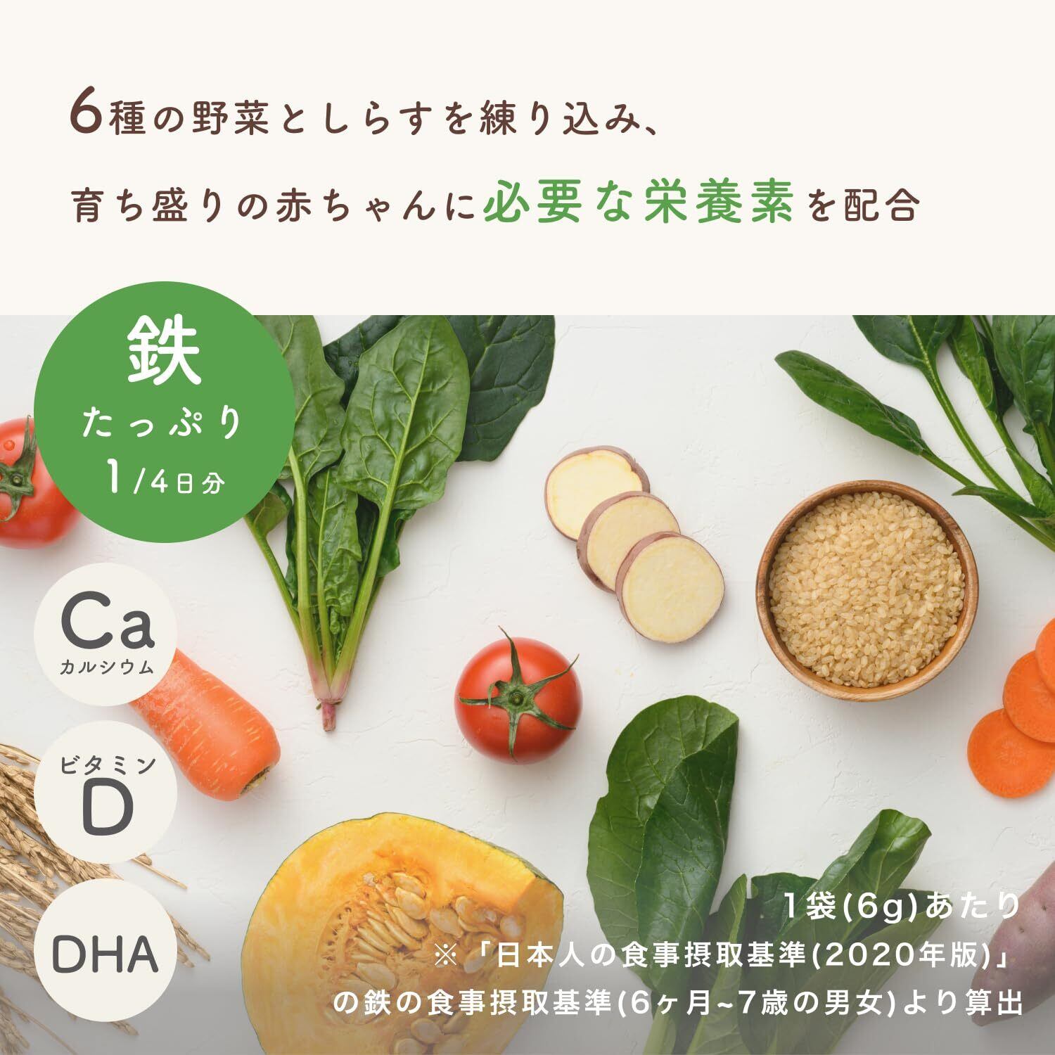 発芽玄米(岐阜県産)、しらすパウダー、かぼちゃパウダー、にんじんパウダー、ほうれん草パウダー、さつまいもパウダー、小松菜パウダー、トマトパウダー、DHAオイル/炭酸カルシウム、ピロリン酸鉄、ビタミンD