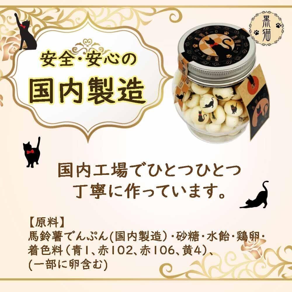 レトロでモダンな10種類のかわいい黒猫イラストが、ボーロにひとつぶひとつぶ描かれたとっても可愛いたまごボーロです。