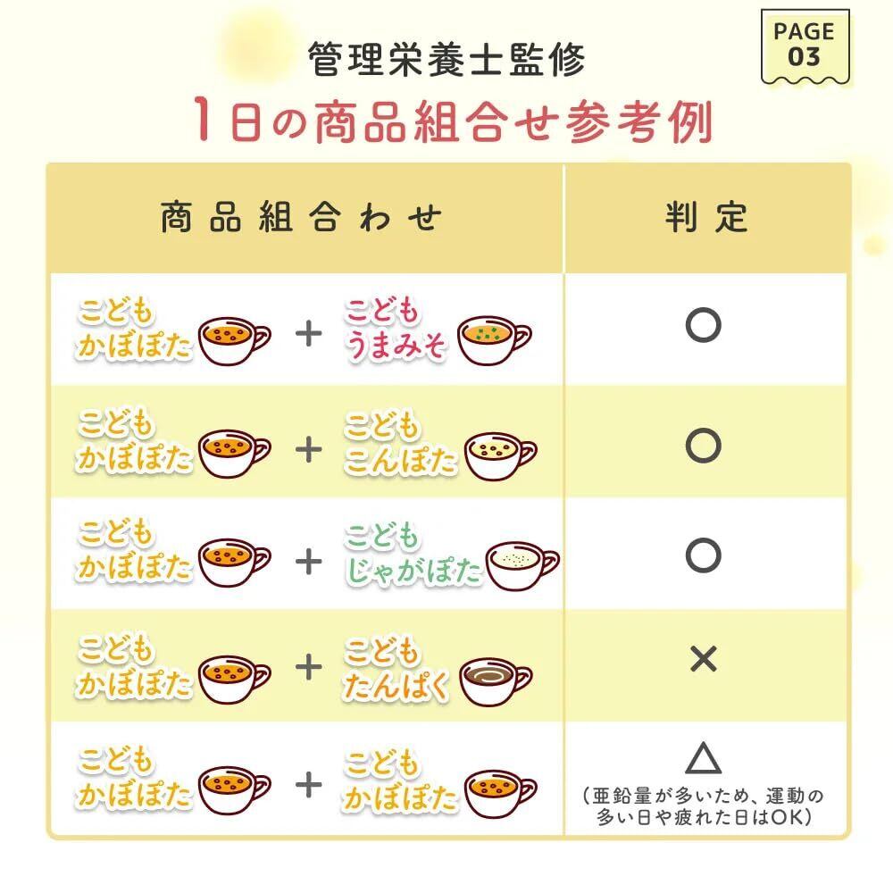 【忙しいパパとママの救世主】 「こどもかぼぽた」は、お子様の成長に欠かせない栄養(鉄分・亜鉛・食物繊維・カリウム・22種の国産野菜)がぎっしり詰まった、牛乳に混ぜるだけの便利なかぼちゃポタージュパウダーです。