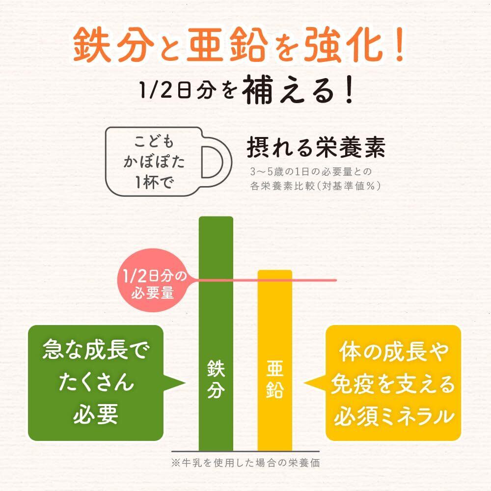 【育ちざかりをサポート】 急な成長で沢山必要な鉄分と、体の成長や免疫を支える必須ミネラルの亜鉛を強化し、こどもかぼぽた1杯で1/2日分を補うことができます。栄養素の量を食材に換算すると、3~5歳の1杯分の場合、鉄分はほうれん草1.3束分、亜鉛は卵3.6個分、カリウムはブロッコリー3房分!(本品7gと牛乳100mlで飲んだ場合)