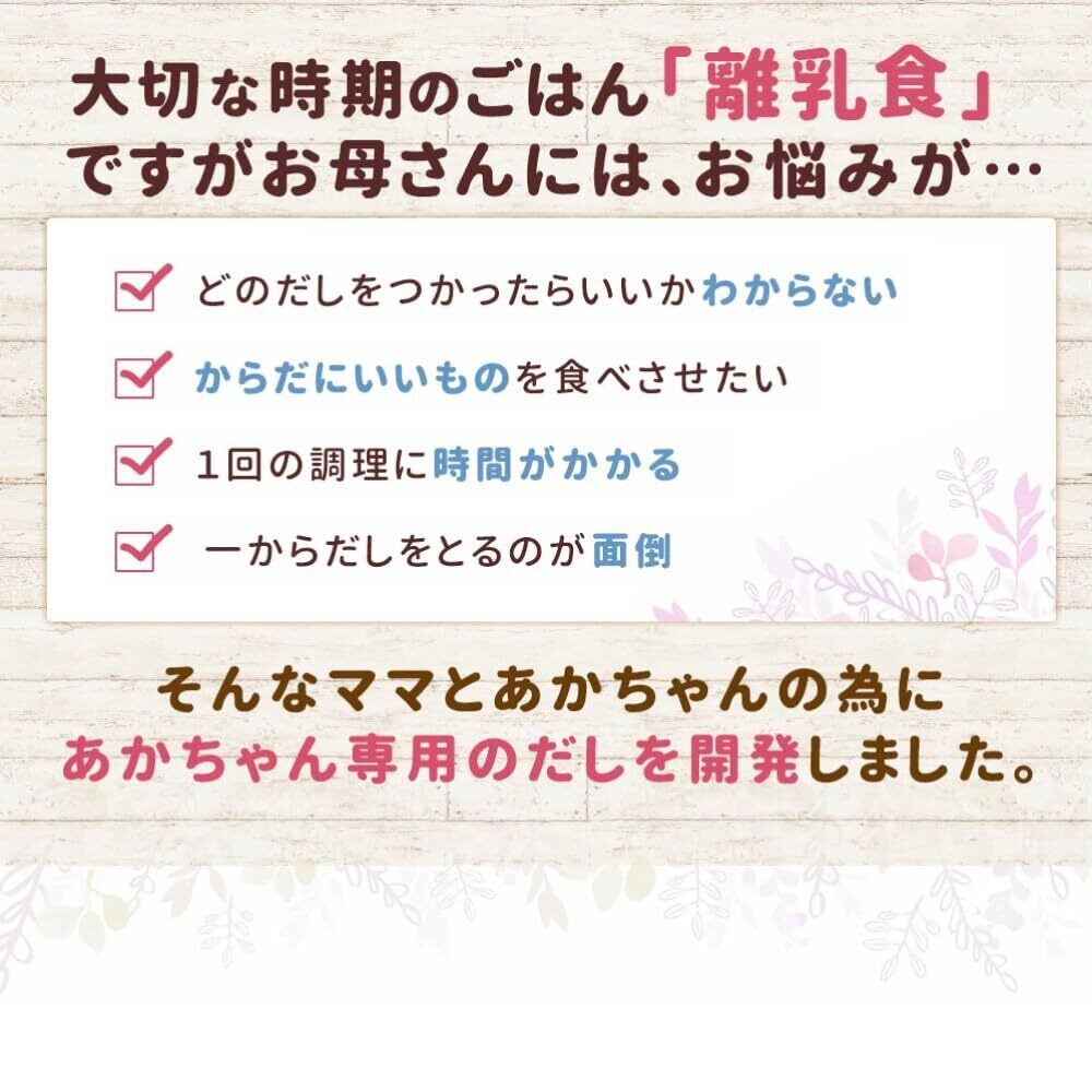 フードコーディネーターと共同開発した、やさしい味わいのあかちゃん専用だしです。手軽に天然だしがとれあかちゃんの『舌育』へお役立てください。