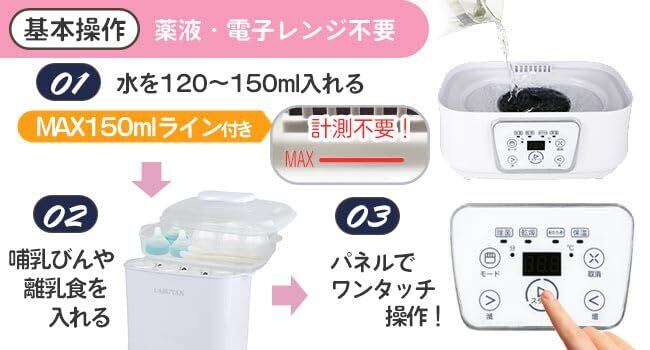 計測不要!電子レンジ不要、水だけで除菌・乾燥OK。(本体内部のプレート部分は毎日水拭きするだけで汚れの付着を防ぎ、きれいに保てます。水拭きの際、本体の吹き出し口やコンセント部分に水が入ると故障の原因になりますのでご注意ください。また清掃の際は必ず電源を落としコンセントを抜いてから行ってください)液晶パネルで操作も簡単。哺乳びん最大8本まで入る大容量なので一度に除菌・乾燥ができます。乾燥後はそのまま哺乳瓶を保管でき、保管ケースとしてもご使用できます。消音機能付きで操作時に赤ちゃんが起きる心配もないです。