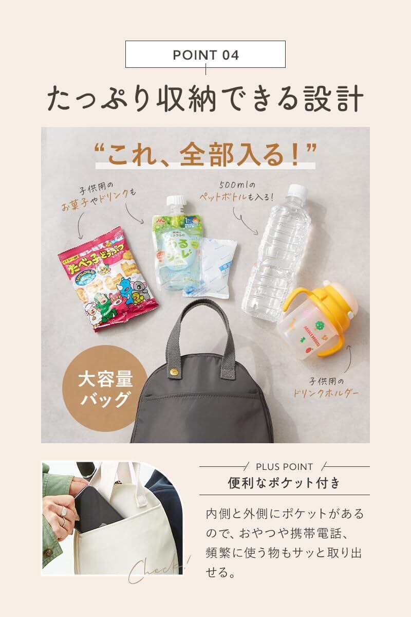 軽量なのに大容量設計 約100gの超軽量で、哺乳瓶・ペットボトル・おやつ・小物類をすっきり収納。マチ幅8cmで見た目以上の収納力です。
