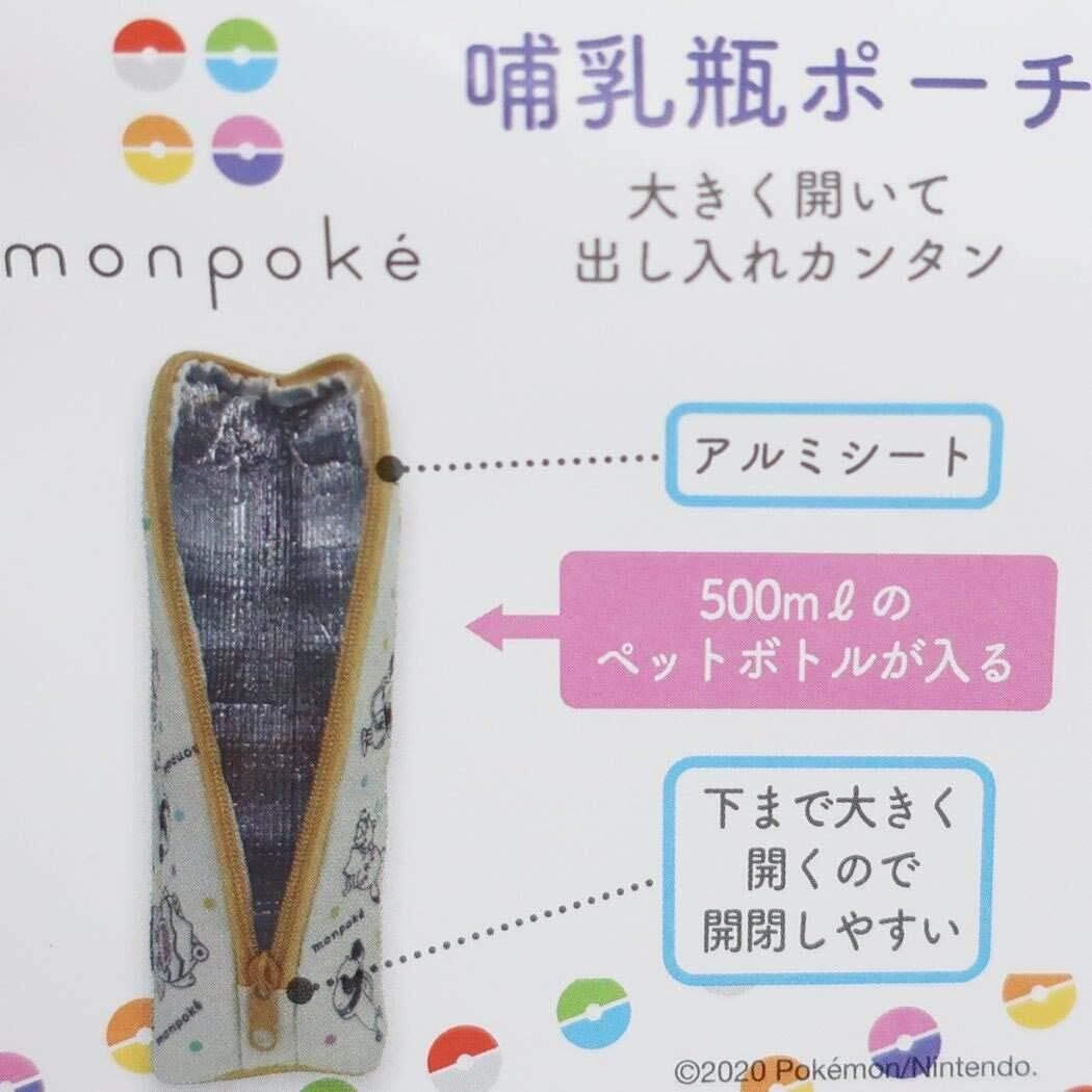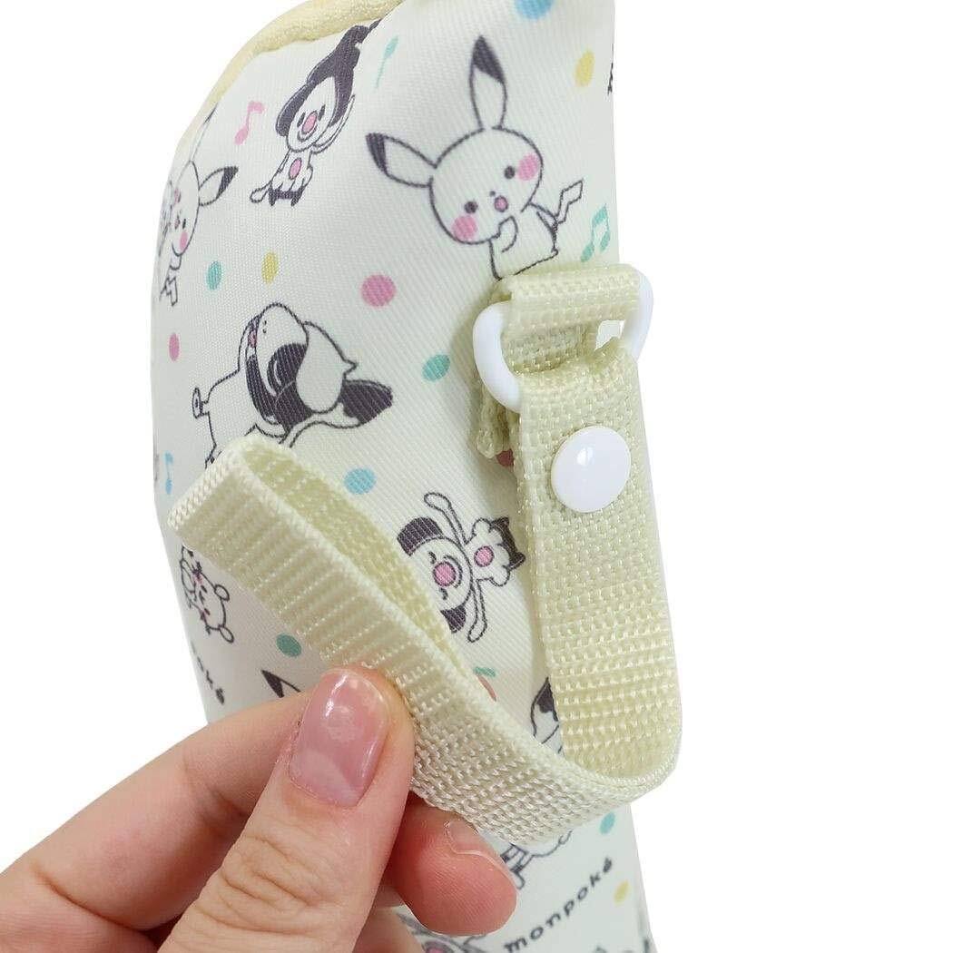 モンポケをデザインした哺乳瓶ポーチ。口開きが良く、出し入れしやすくなっています。内側にはアルミシートを使用しています。500mlのペットボトルにも対応しています。