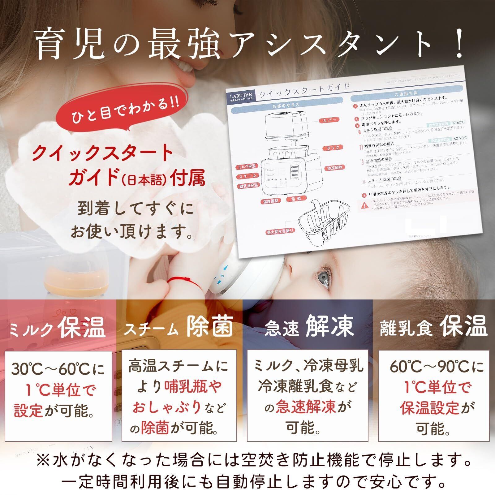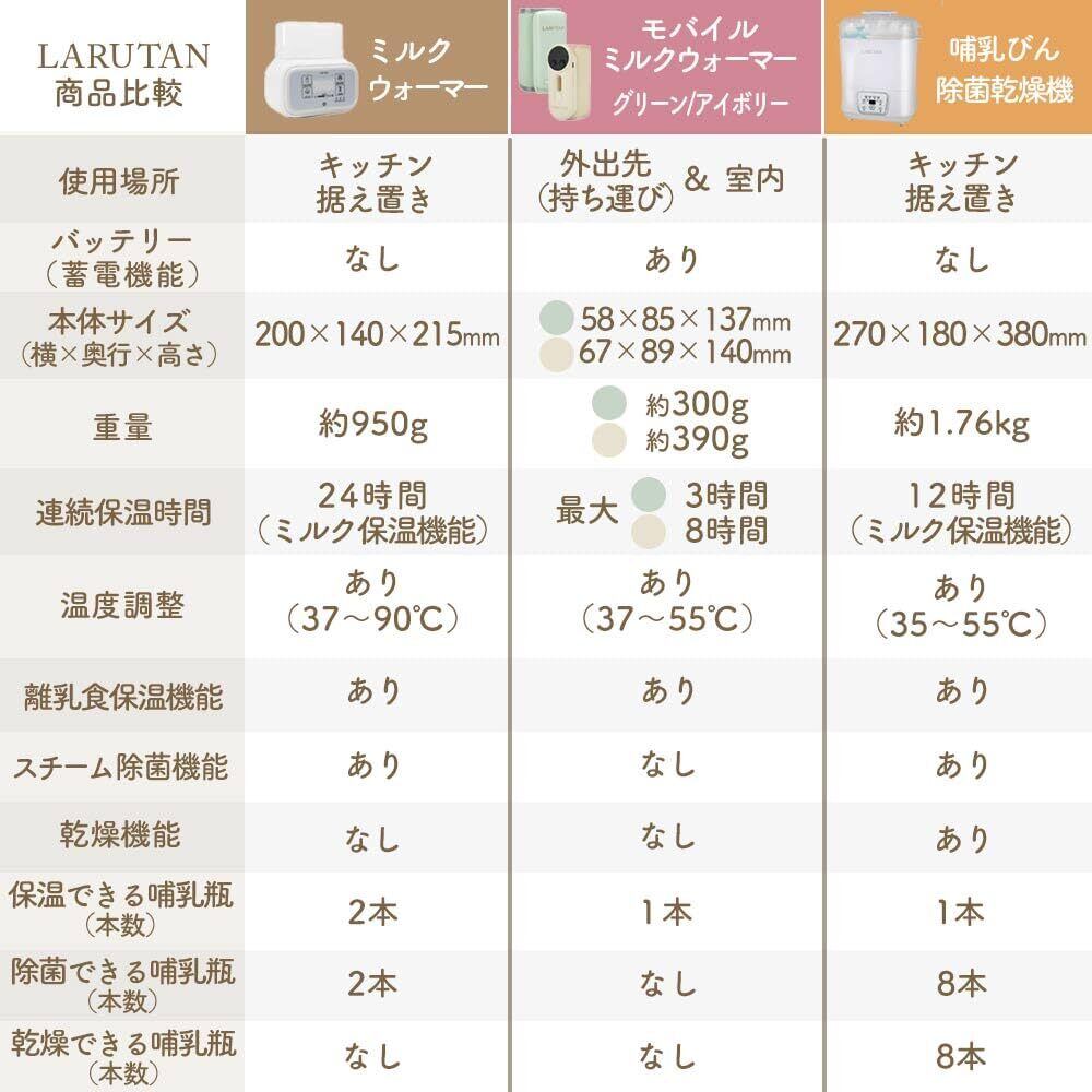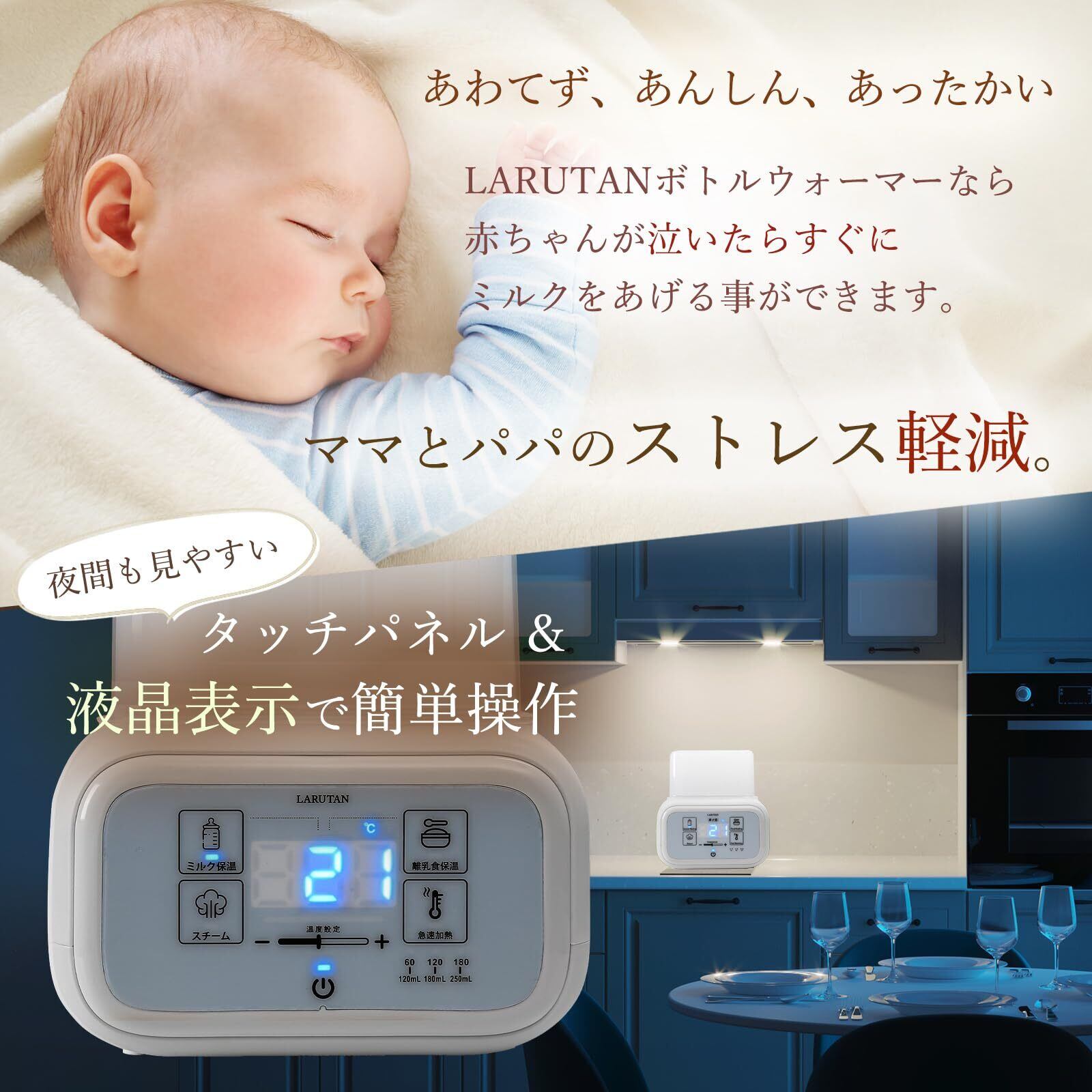 【育児の最強アシスタント!】 ・LARUTANボトルウォーマーなら赤ちゃんが泣いてすぐにミルクをあげられます。ママとパパのストレスも軽減。 【授乳上手は寝不足知らず】 ・夜間に熱湯を沸かしたり、注いだりしなくて良いので安全です。タッチパネル、夜間も見やすいバックライトで簡単操作。