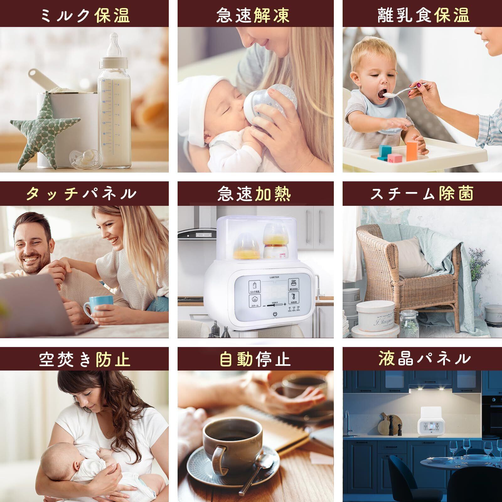 【1台9機能】 多彩な9機能で、他社商品と比較して圧倒的に高機能です。 ミルク保温・スチーム除菌・離乳食保温・急速解凍・急速加熱・タッチパネル・空焚き防止・自動停止・夜間も見やすいバックライト