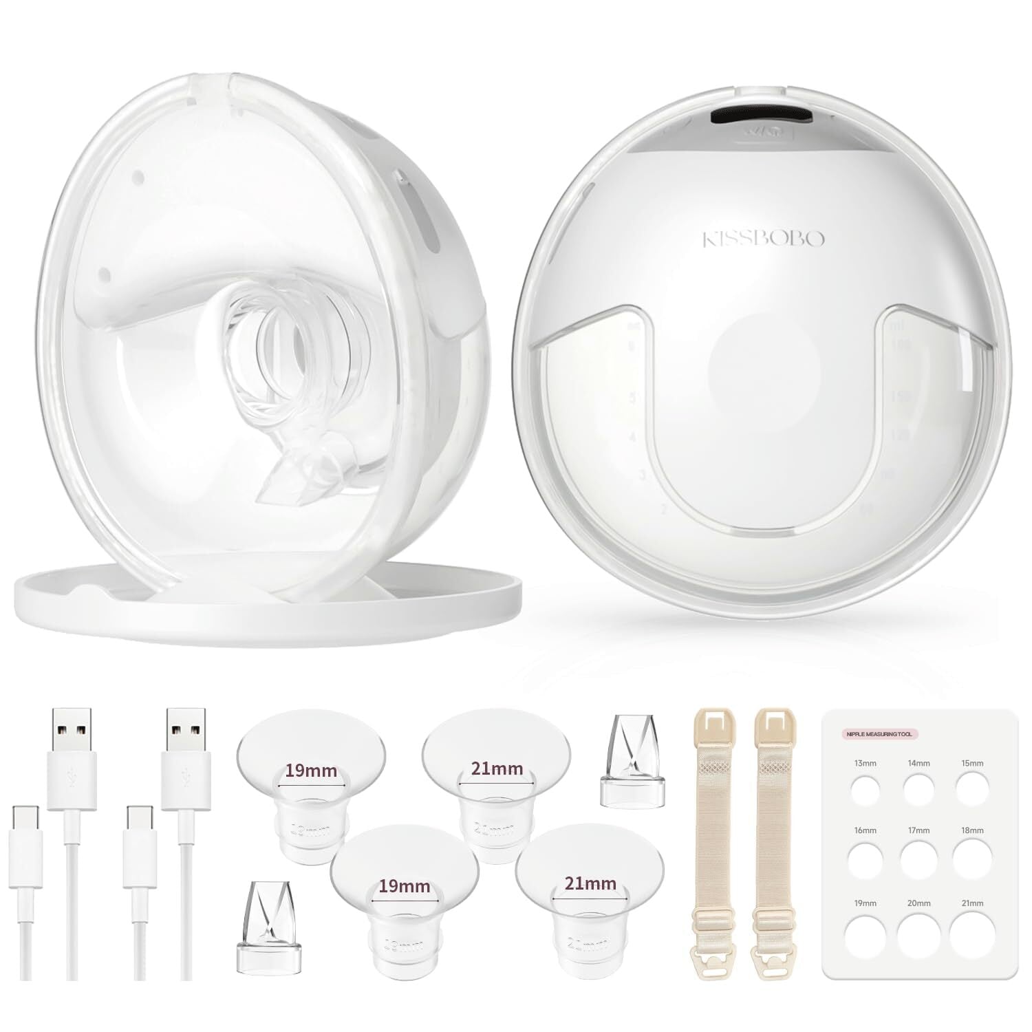 付属コンポーネント 19mm/21mm フランジ, ダックビルバルブ, 充電ケーブル, 延長ショルダーストラップ, 搾乳器フランジ