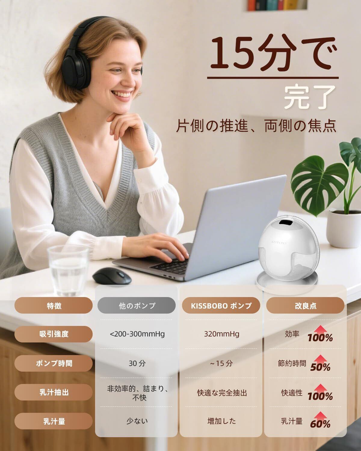 【320mmHgのパワフルな吸引力】 320mmHgの強力な吸引力で、母乳をすばやく完全に搾り出します。お急ぎのママや、凝り固まった母乳をすばやく改善したいママに最適です。快適さと安全性を確保しながら、より多くの母乳を短時間で得ることができます。