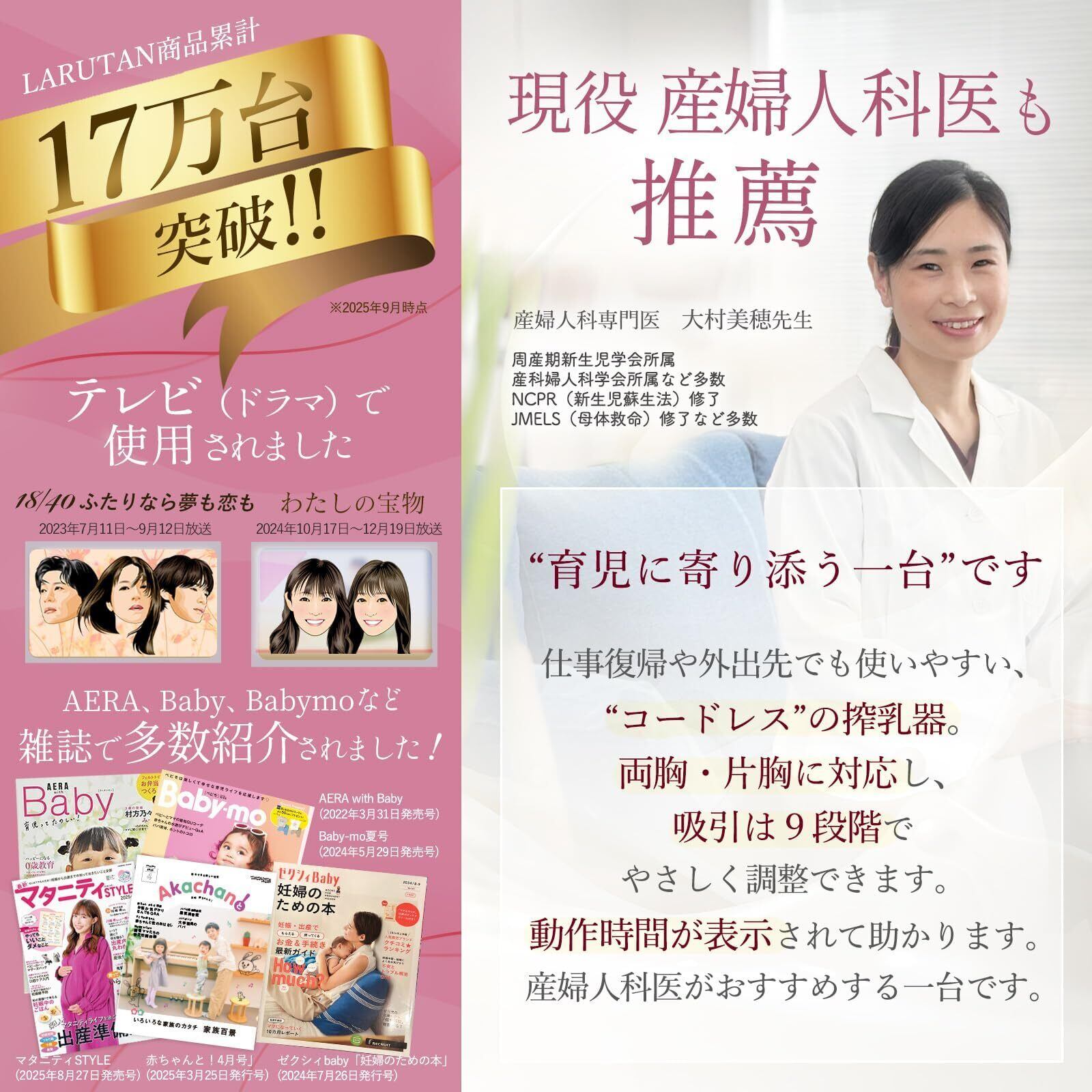 【産婦人科医も推薦 】搾乳機 電動搾乳機 自動搾乳機 LARUTAN さく乳器 片胸・両胸 同時搾乳 どちらも 対応 充電式 ワンタッチ 操作 Smart-Dual (V1タイプ(ピンク))