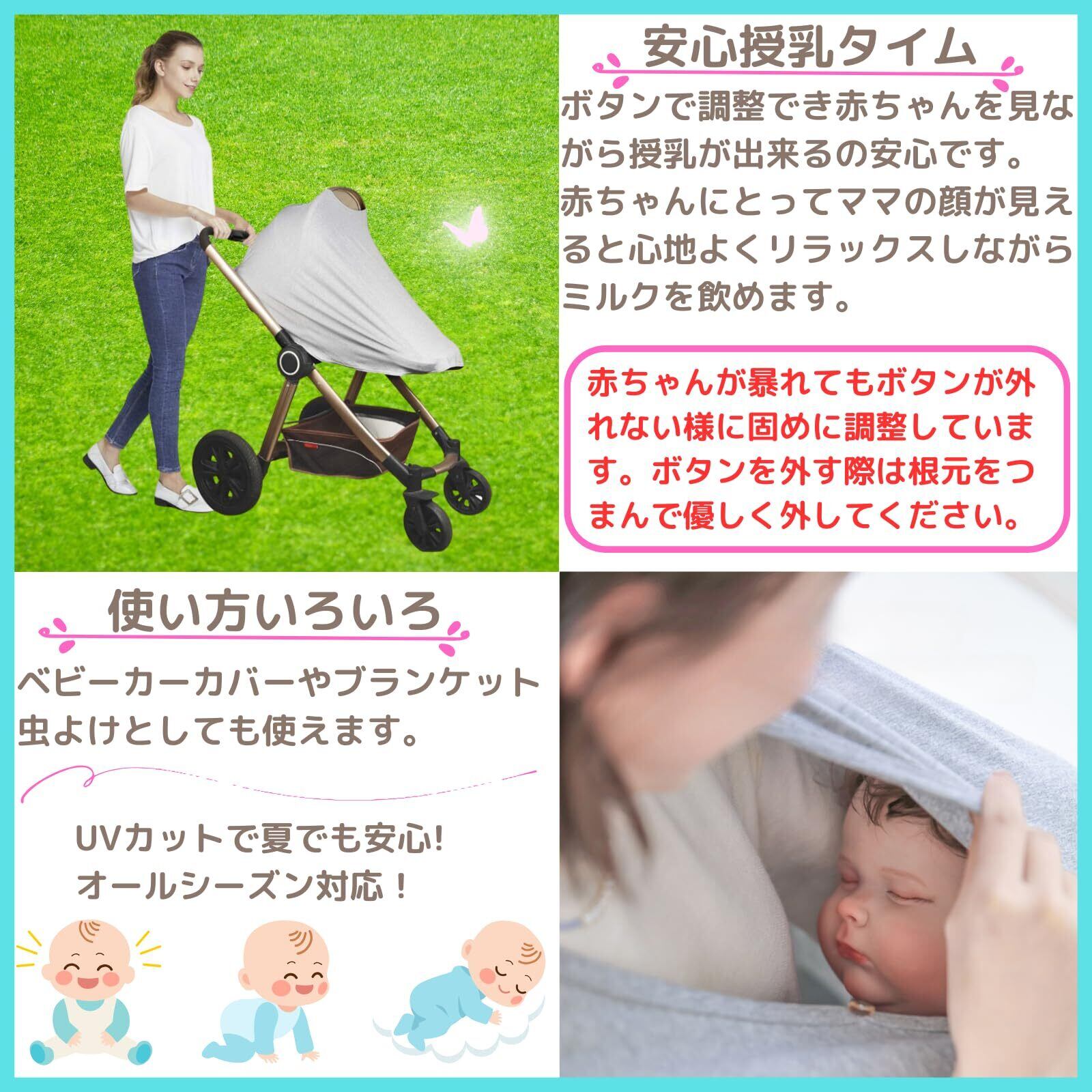 【オシャレなデザイン】この商品を開発する過程でアンケート調査を最も多かったのが、忙しい授乳時期でも「オシャレなママでいたい」「キレイな女性でいたい」という意見でした。性能面だけではなくデザイン性にもこだわりました。授乳だけでなく、虫よけやベビーカーカバー、そしてママの羽織りやストールとしても活用できます。産前から授乳期終了後まで長くお使いいただけます。また、3種類のカラーバリエーションを取り扱っているため、お好みに合わせて選んでいただけます。