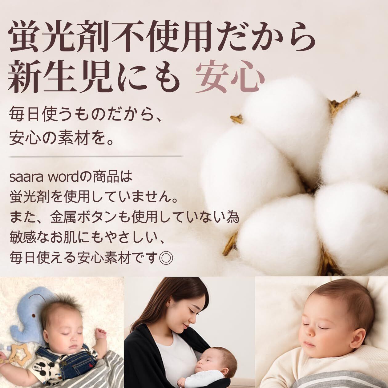【綿素材で肌にやさしい】 肌ざわりの良い綿95%+ポリウレタン5%の混紡素材を採用。 綿100%では伸縮性に欠け、シワにもなりやすいため、着脱しやすく形を保ちやすい絶妙な配合にこだわりました。 赤ちゃんにもママにも嬉しい、やさしい肌触りと快適な使い心地です。