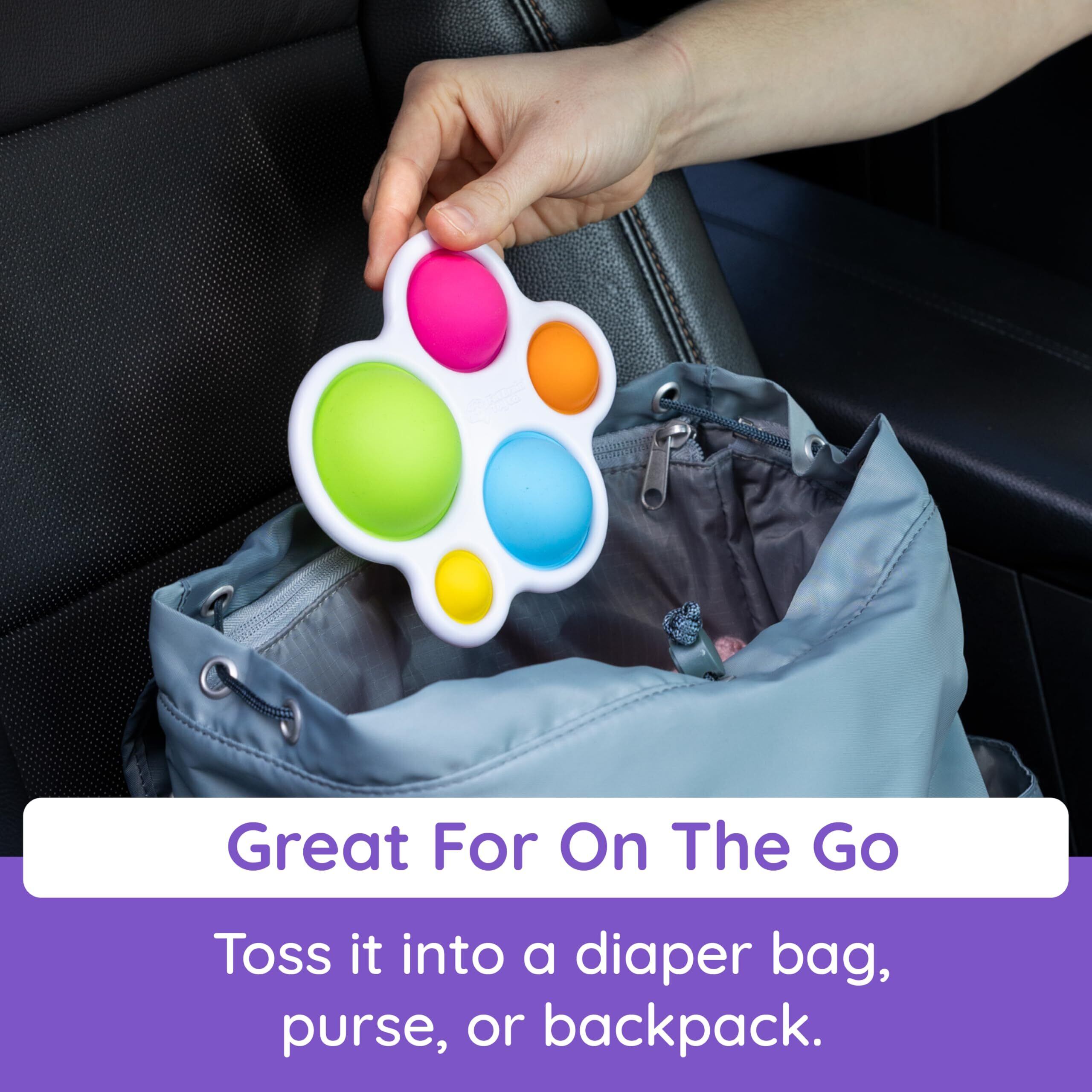 アメリカ発 知育玩具メーカーFat Brain Toys (ファットブレイントイズ) 社の赤ちゃんおもちゃ Dimpl (ディンプル)。カラフルな丸いシリコンをポコン! と押して、赤ちゃんの指先を刺激してあげましょう。