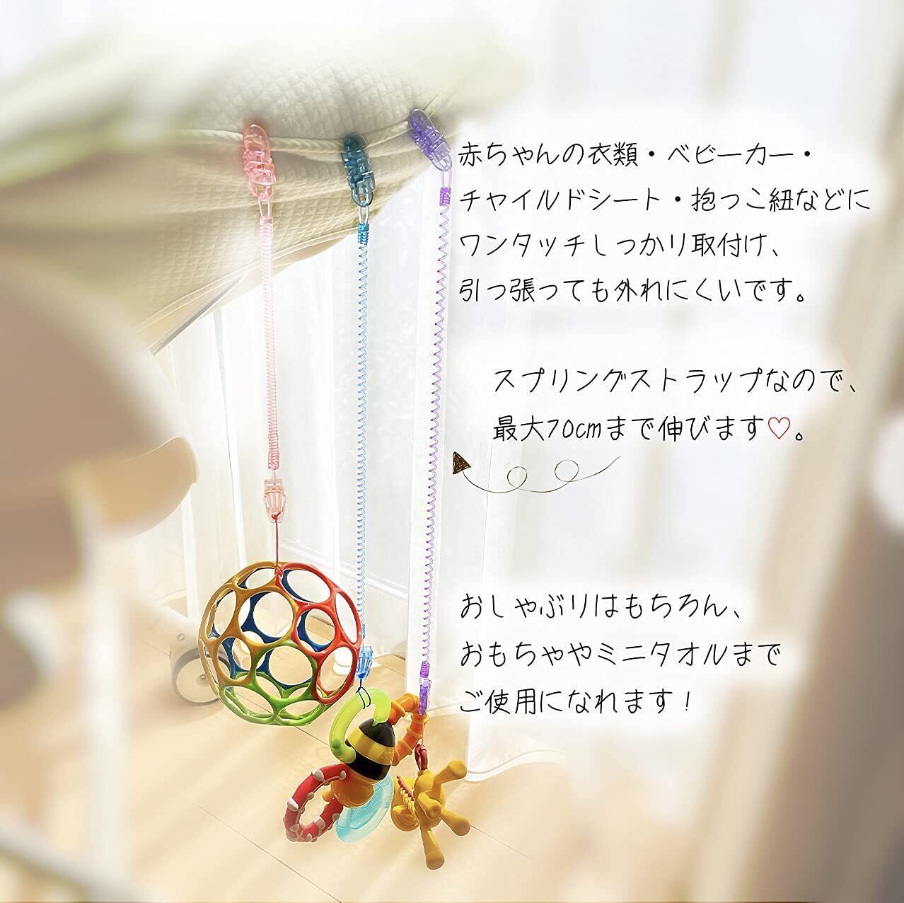 赤ちゃんの衣類・ベビーカー・ チャイルドシート・抱っこ紐などにワンタッチでしっかり取付け、引っ張っても外れにくいです。おしゃぶりはもちろん、 おもちゃやミニタオルまで ご使用になれます!